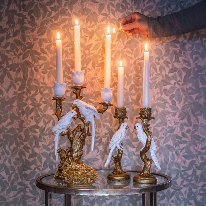 En pampig och dekorativ ljusstake där två vita kakaduor sitter på en detaljrik gren i antikguld. Läs mer