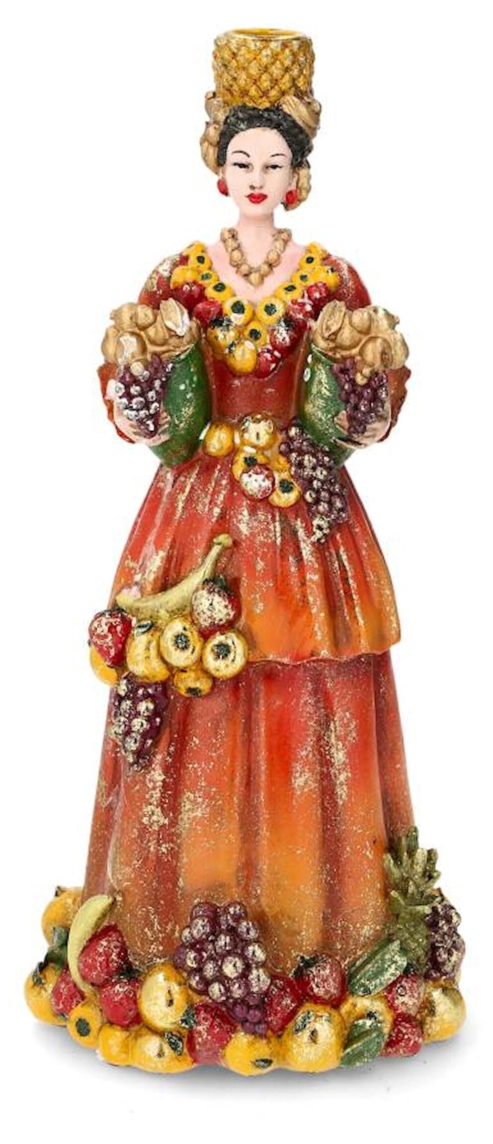 En färgstark och dekorativ ljusstake formad som en elegant kvinna klädd i en röd klänning, rikt utsmyckad med frukter i varma, levande toner. De vackra detaljerna och den glittrande finishen ger ett exklusivt och lekfullt uttryck som direkt drar blickarna till sig.