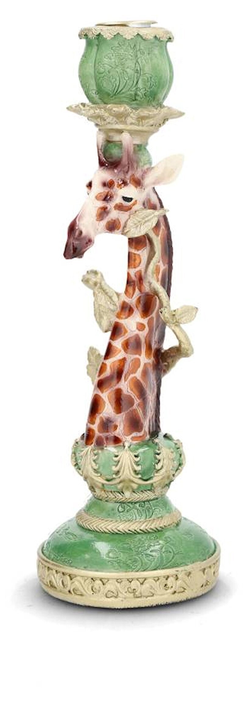 En lekfull och uttrycksfull ljusstake formad som en giraff. De mjuka gröna tonerna kombineras med dekorativa detaljer i guld och ett charmigt handgjort uttryck som ger både värme och personlighet.