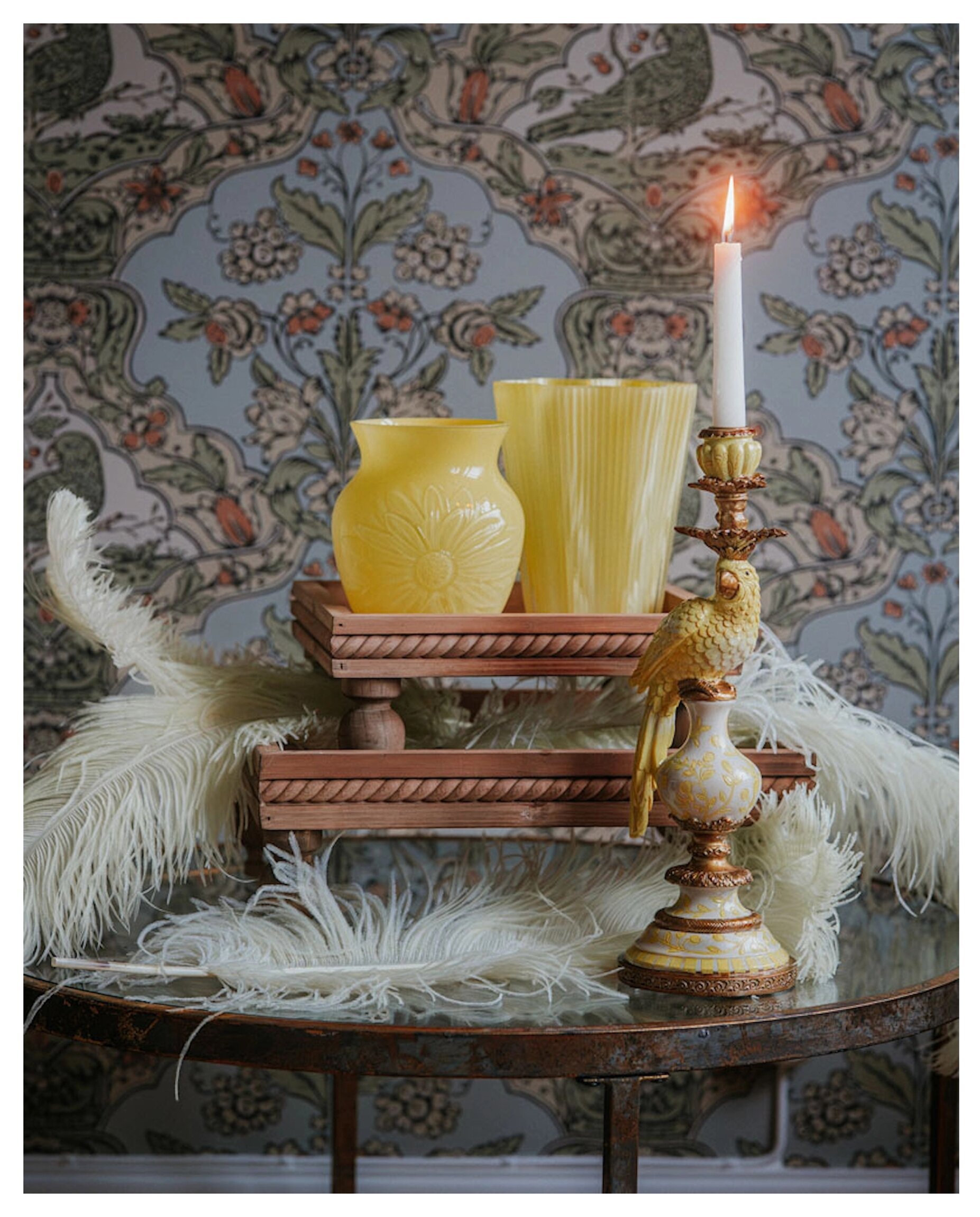 En elegant och dekorativ ljusstake med en vackert detaljerad gul papegoja som stolt sitter på en dekorativ fot i guld och vitt. Läs mer