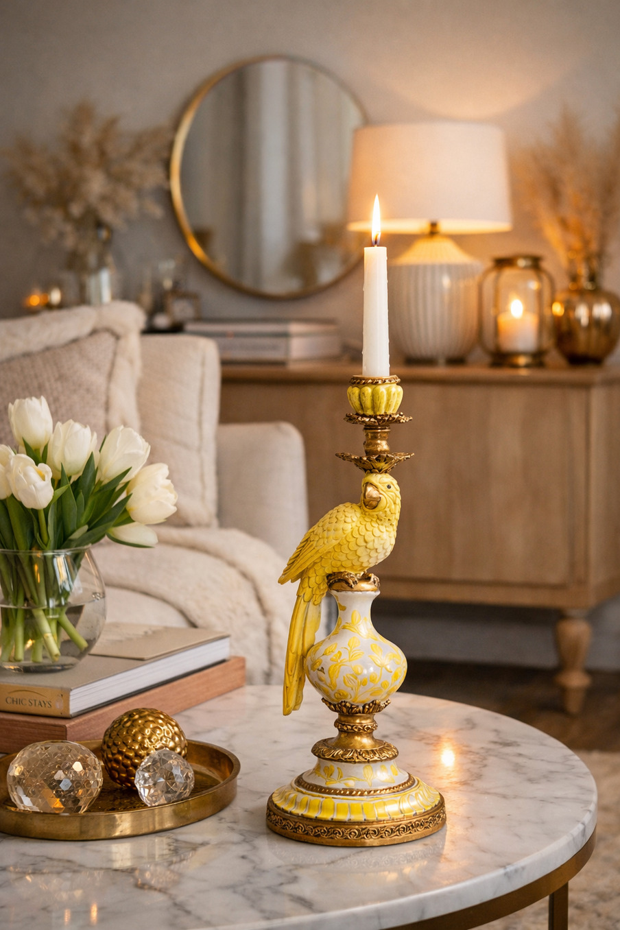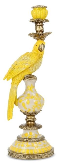 En elegant och dekorativ ljusstake med en vackert detaljerad gul papegoja som stolt sitter på en dekorativ fot i guld och vitt. De mjuka formerna och de fina detaljerna ger ett exklusivt och levande uttryck.