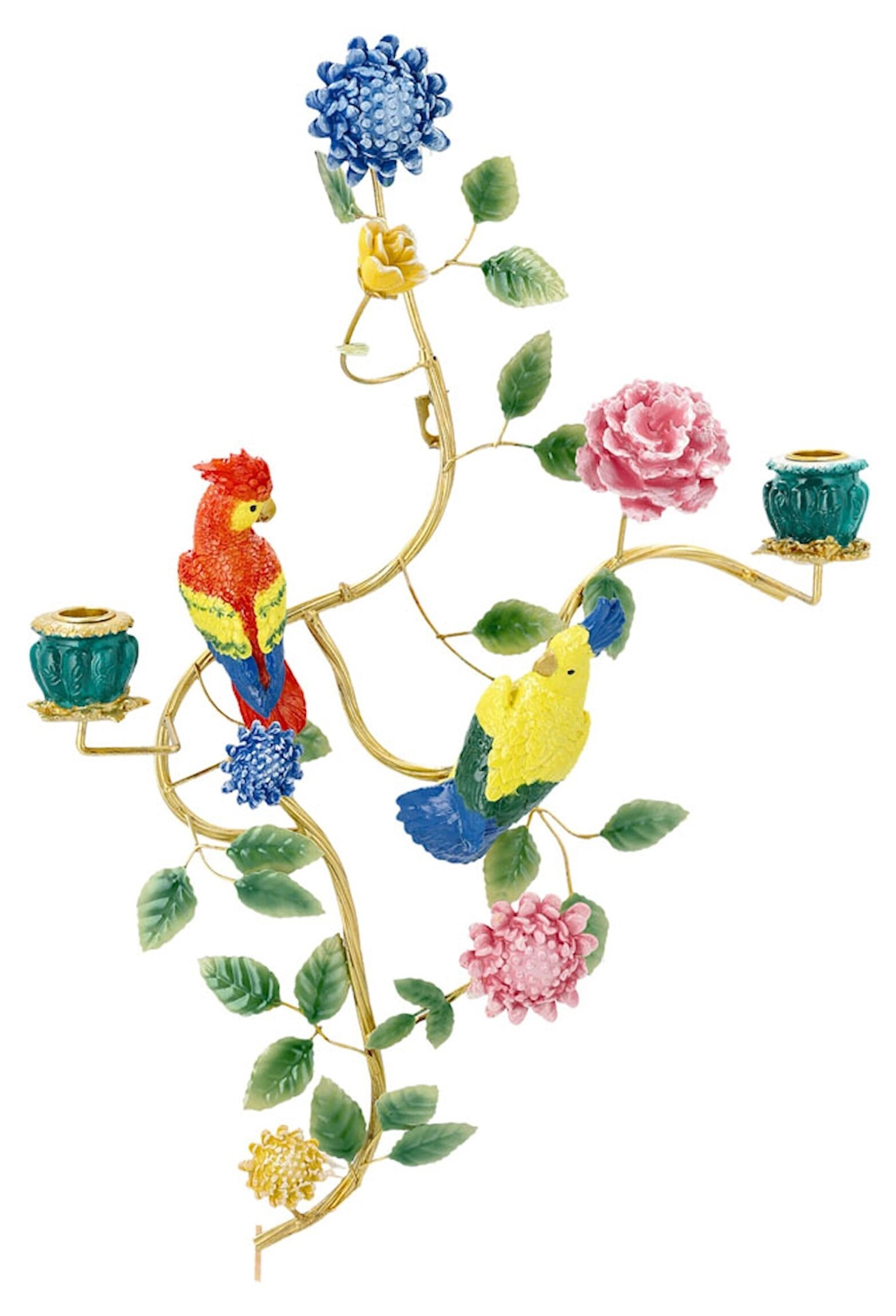 En färgstark väggdekoration med detaljrika fåglar, blomster och dekorativa blad som skapar ett levande och exotiskt uttryck. De två integrerade ljushållarna ger möjlighet att förstärka stämningen med levande ljus och göra dekorationen till ett riktigt blickfång.