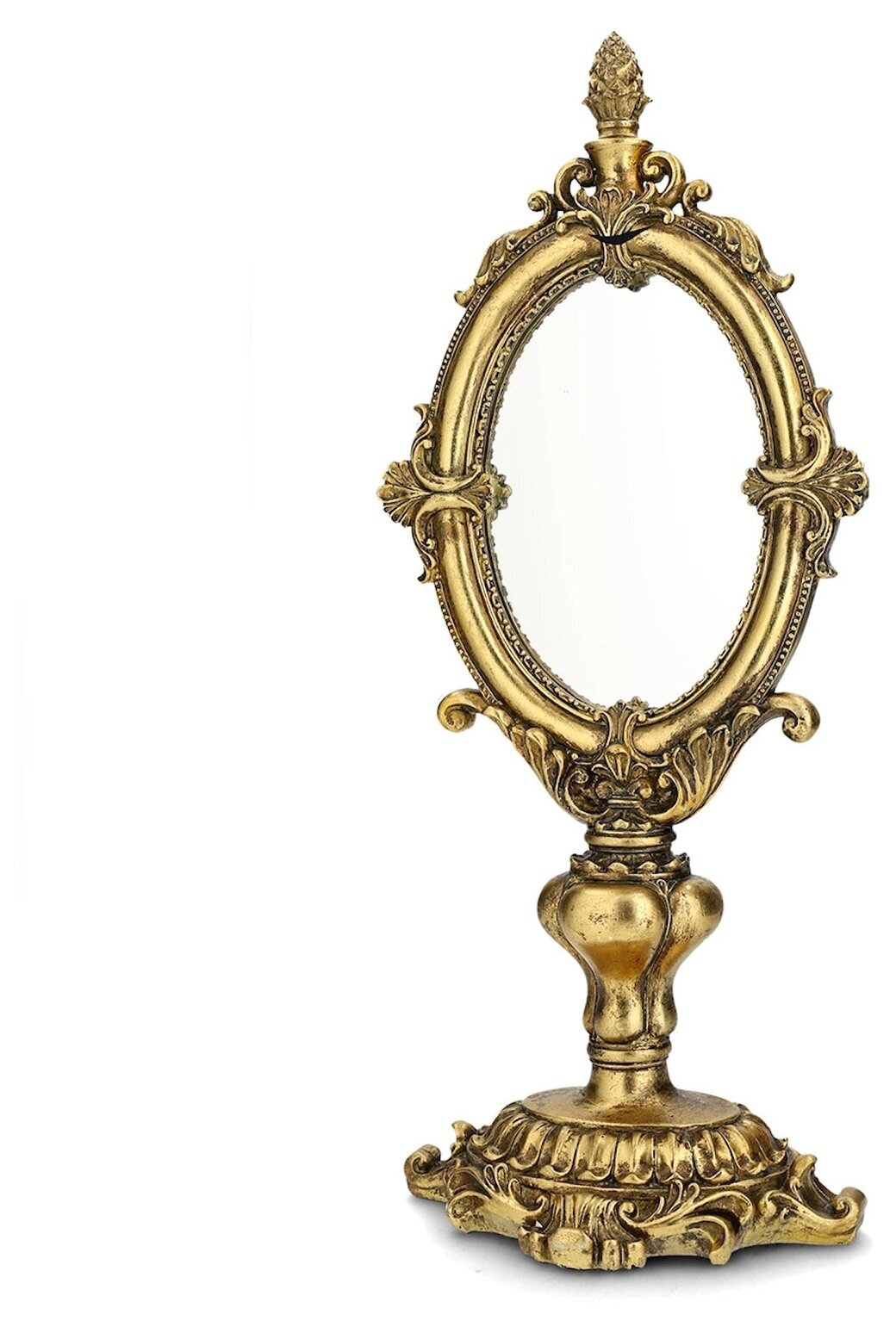 En dekorativ spegel på fot med en vackert utsmyckad ram i klassisk stil. Den guldfärgade finishen och de eleganta detaljerna ger spegeln ett tidlöst och exklusivt uttryck som passar perfekt i både klassiska och romantiska miljöer.