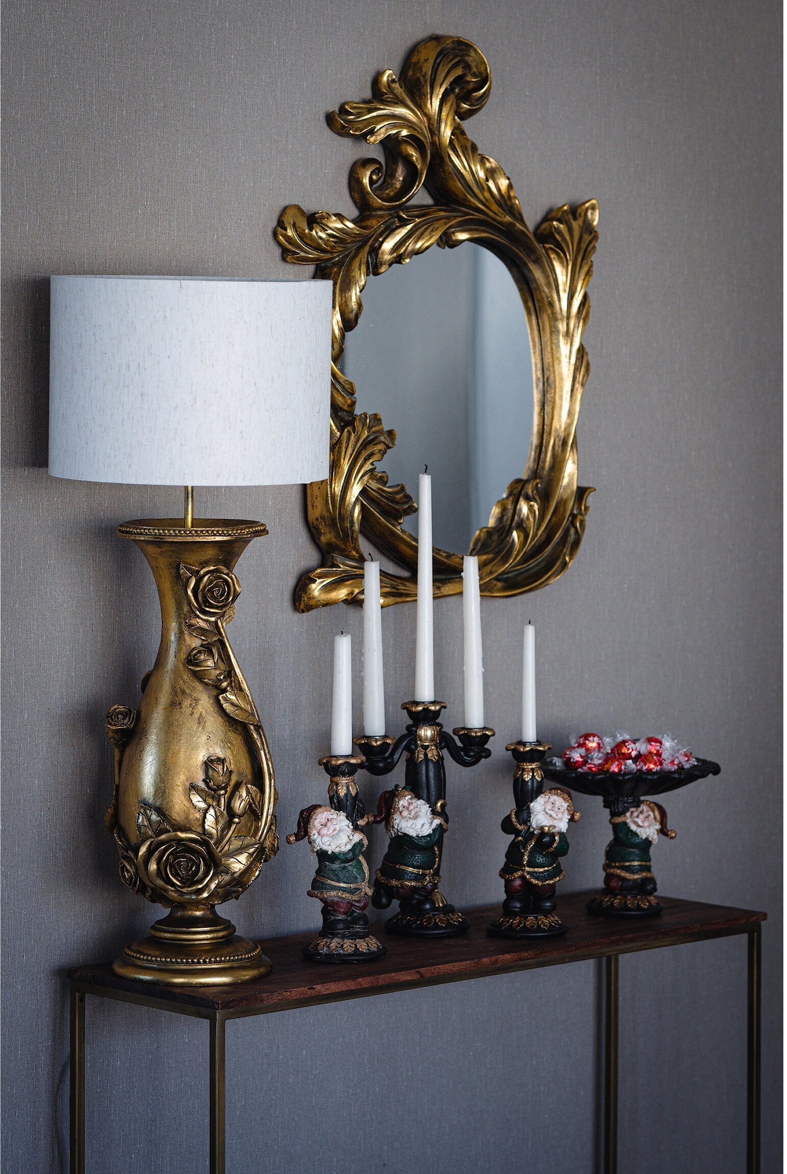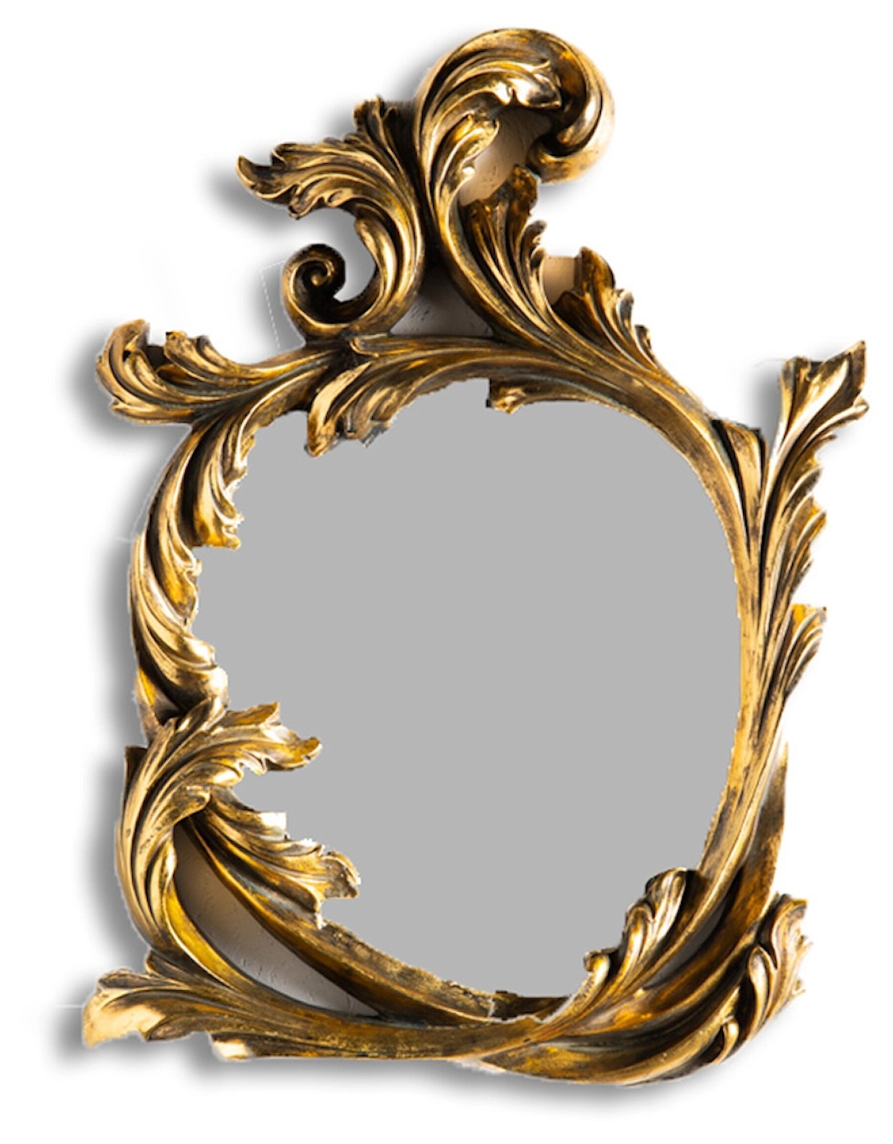 En dekorativ väggspegel med en rikt utsmyckad ram i klassisk stil. Den guldfärgade finishen och de mjukt formade ornamenten ger spegeln ett elegant och tidlöst uttryck som skapar en lyxig känsla i rummet.