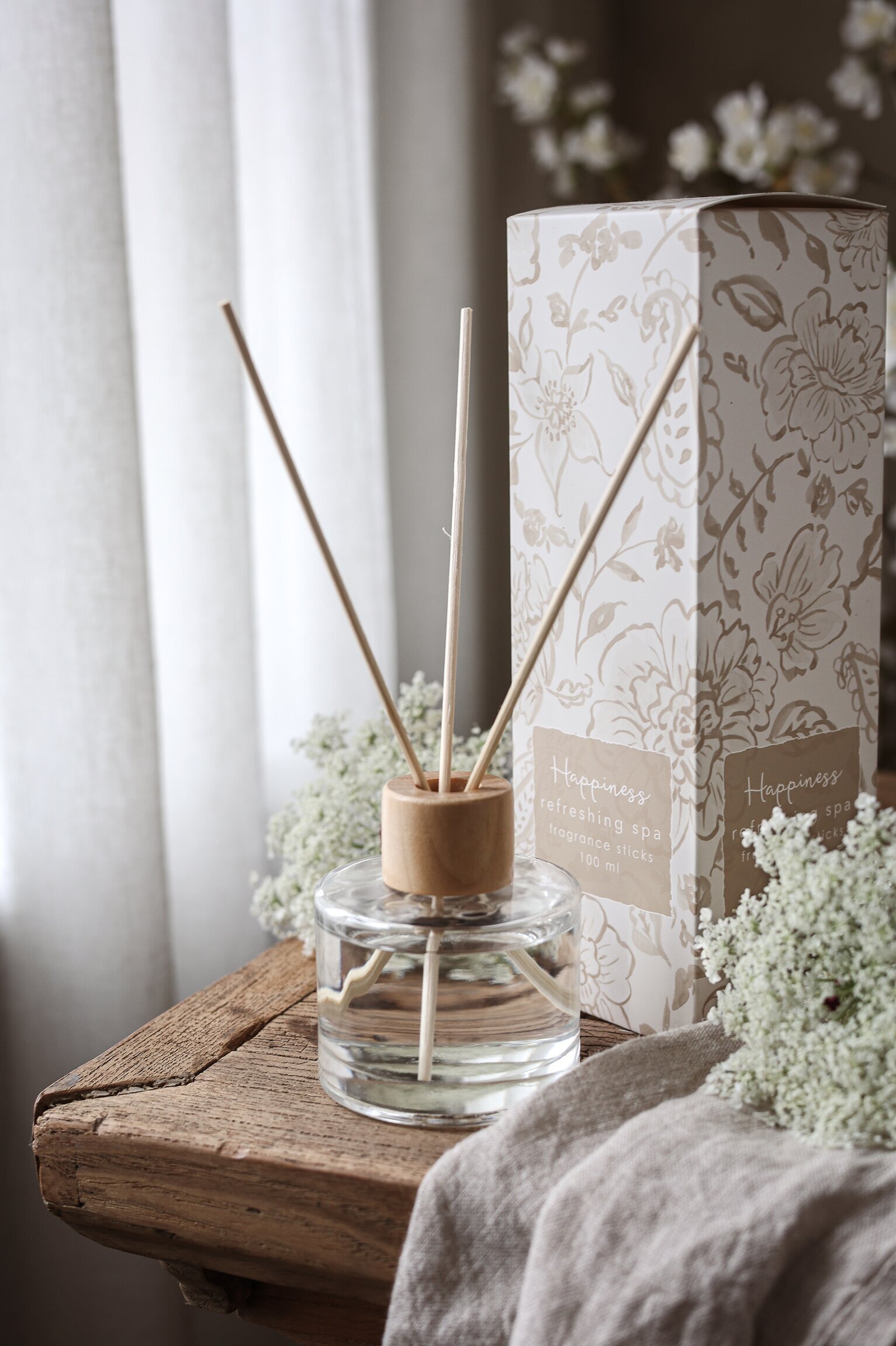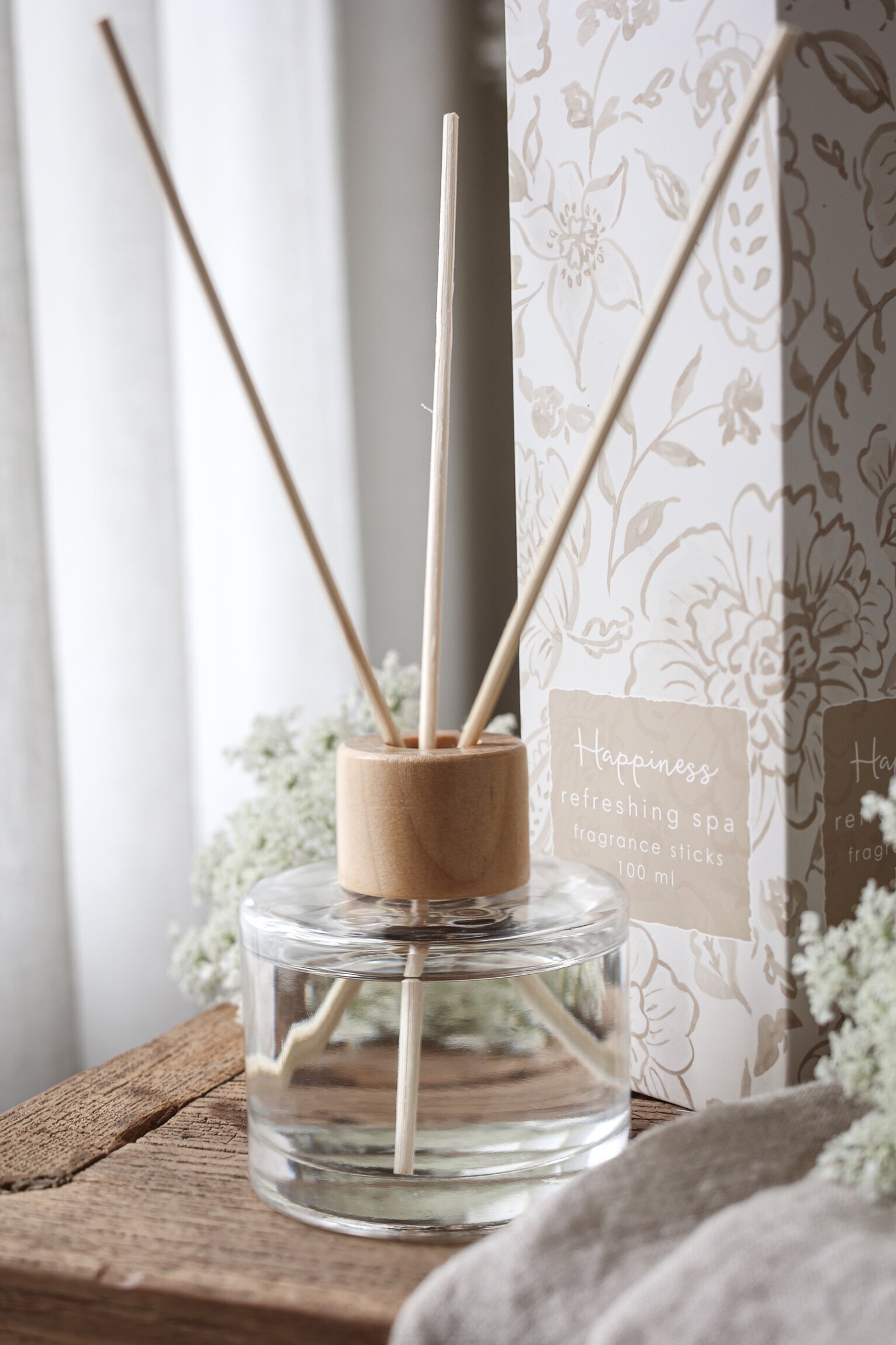 Doften är Refreshing Spa – en ren, frisk och elegant doft som skapar en rofylld men samtidigt upplyftande atmosfär. Doften börjar spridas när pinnarna har dragit åt sig oljan, vanligtvis inom cirka 48 timmar, och räcker i ungefär två månader (beroende på rummets storlek, temperatur och luftcirkulation).