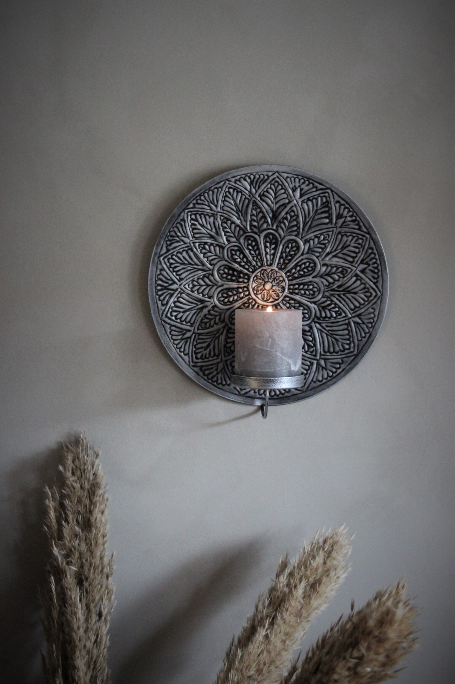 Bilden erbjuder en detaljerad vy av väggljusstaken Mandala Smoke med en diameter på 25 cm från varumärket Majas Cottage. Detta föremål, noggrant komponerat för att framhäva sin dekorativa funktion, är placerat mot en mjukt tonad bakgrund i butiken RumAttÄlska.se, som är känd för att inspirera sina besökare att skapa stilfulla och harmoniska heminredningar.