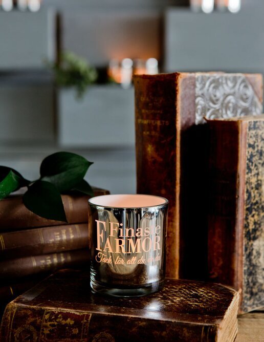 Vacker ljuslykta med texten Finaste Farmor. Ljuslyktan har en silver-finish med vit insida.