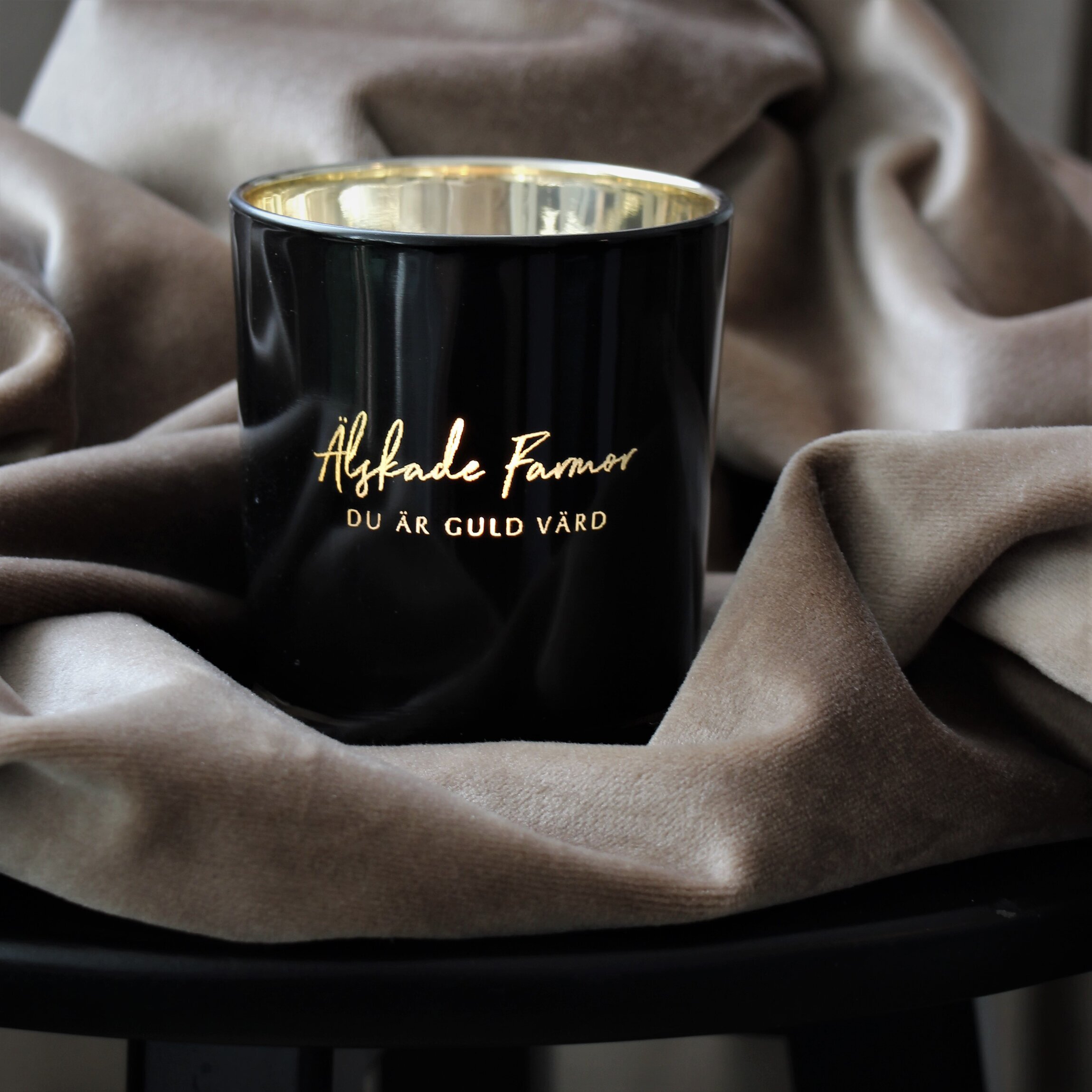 Ljuslyktan på bilden är iögonfallande med sin glänsande, svarta yta som elegant fångar ljuset. På framsidan är orden “Älskade Farmor” och “Du är guld värd” präntade i gyllene bokstäver, vilket skapar ett vackert visuellt kontrast. Den gyllene texten framhäver budskapet på ett sätt som utstrålar värme och omtanke, samtidigt som det ger ett stilfullt intryck.