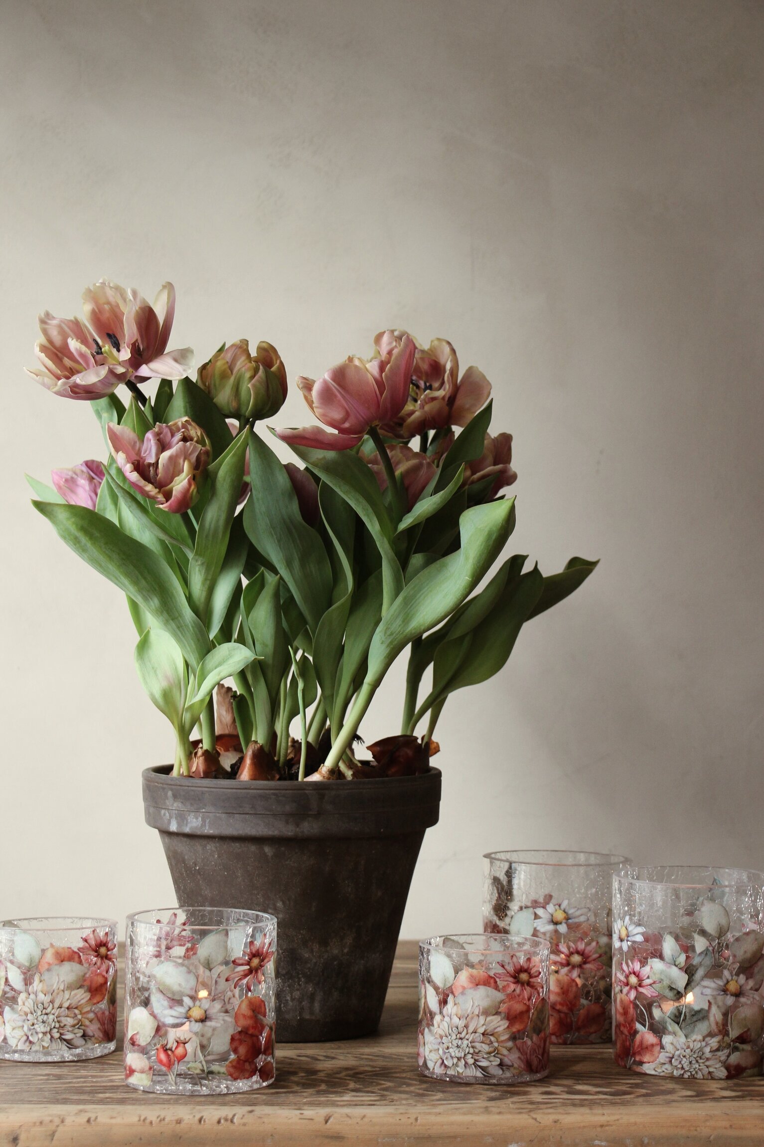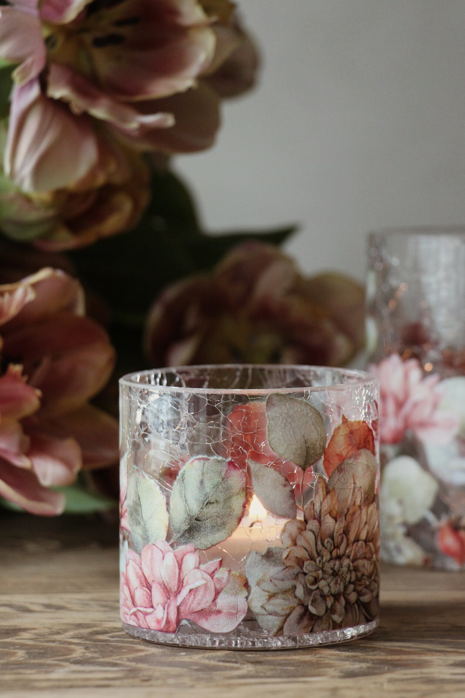 Vacker ljuslykta i krackelerat glas med blommig design som ger ett vackert sken och skapar en mysig stämning i rummet. Finns i tre olika storlekar & passar fint som dekoration i alla hemmets rum.
