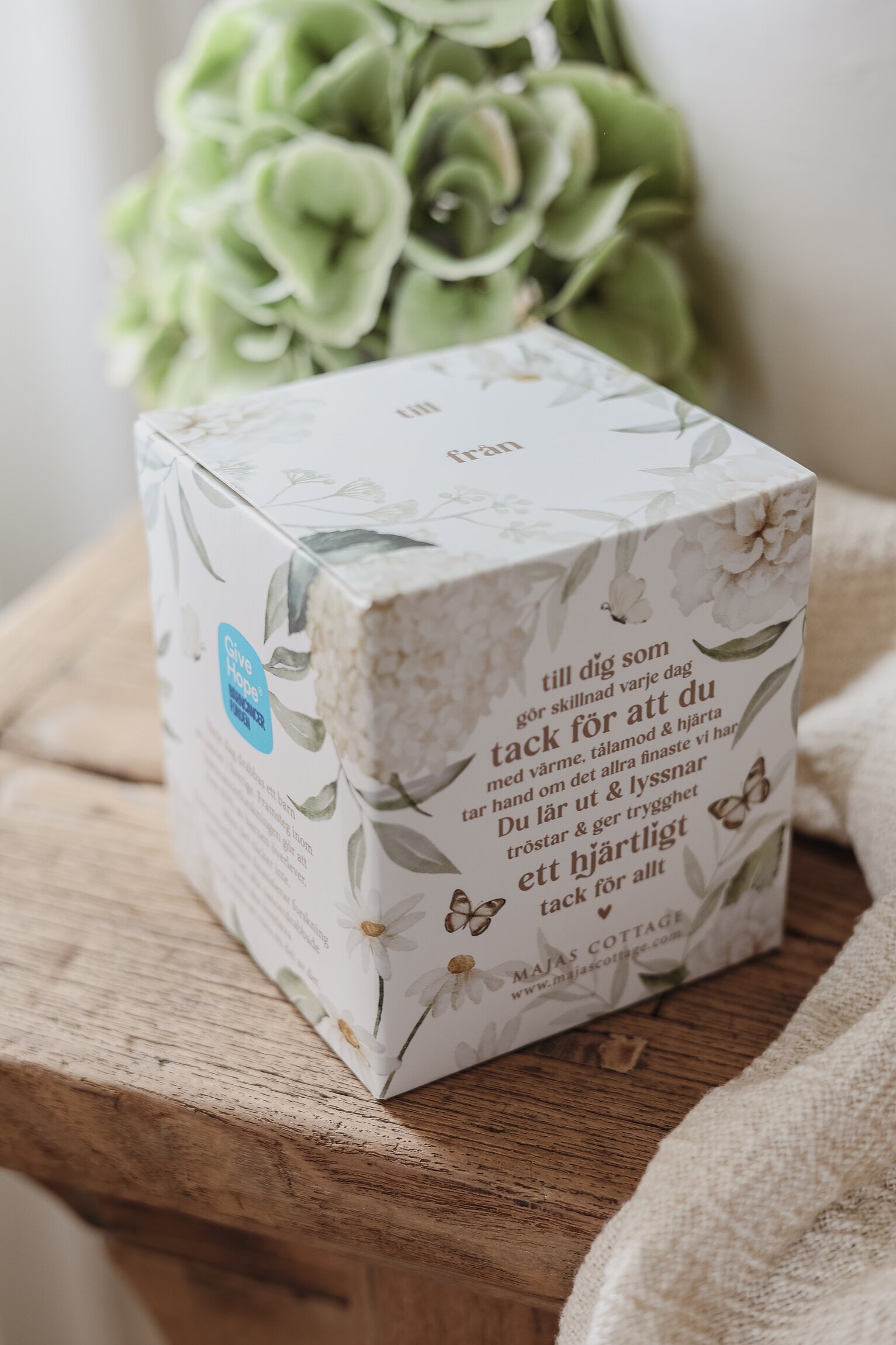 Lyktan har en stilren matt vit finish som ger ett mjukt och behagligt sken. Den levereras i en vacker gåvobox, redo att ges bort.