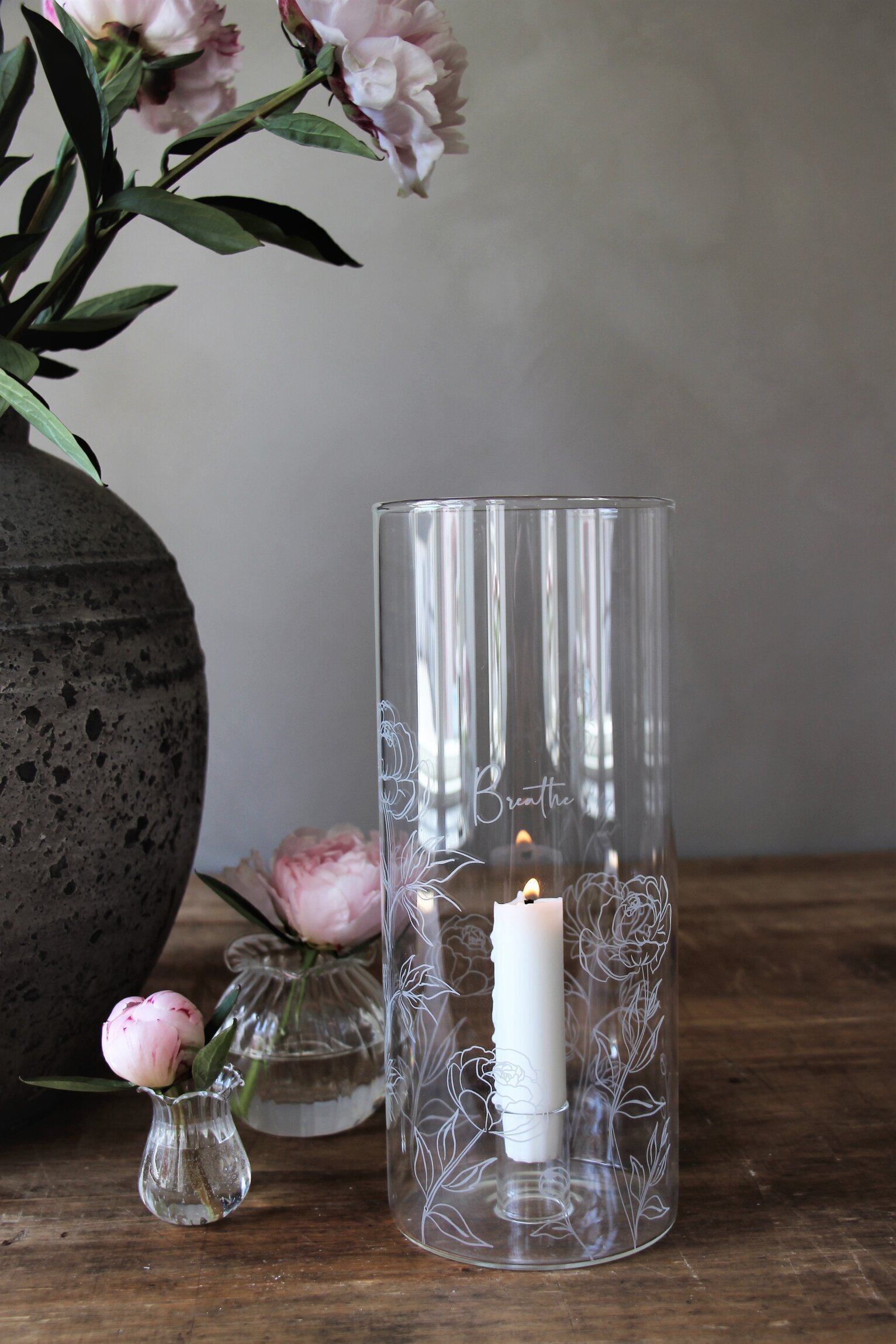 Ljuslykta i klarglas med plats för kronljus från Majas Cottage. Text - Breathe. Läs mer