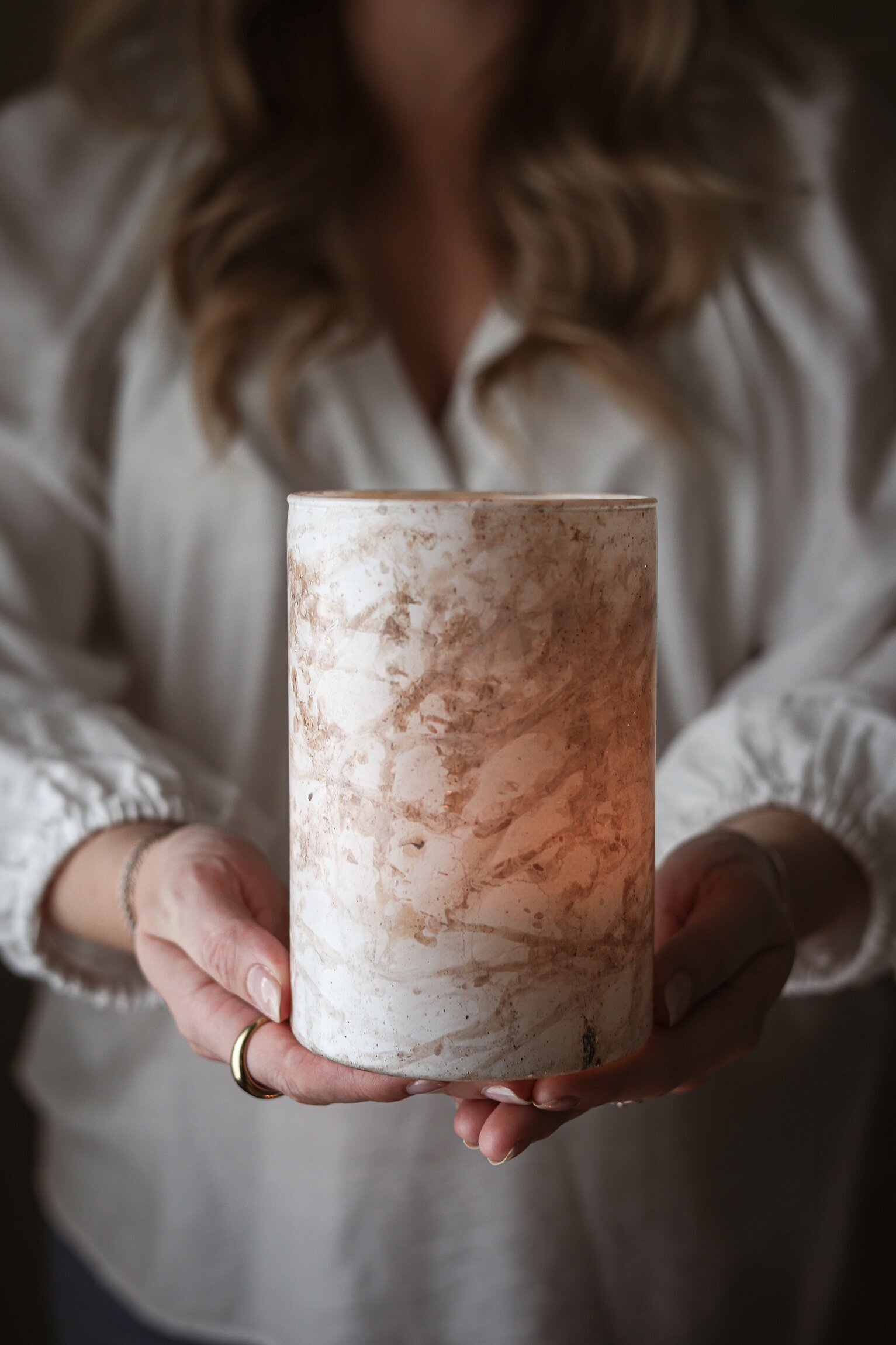 Varje lykta är handgjord i glas och har en vacker, levande finish i toner av vitt, sand och grått. Det ger ett mjukt och stämningsfullt ljus som skapar en varm känsla i rummet.