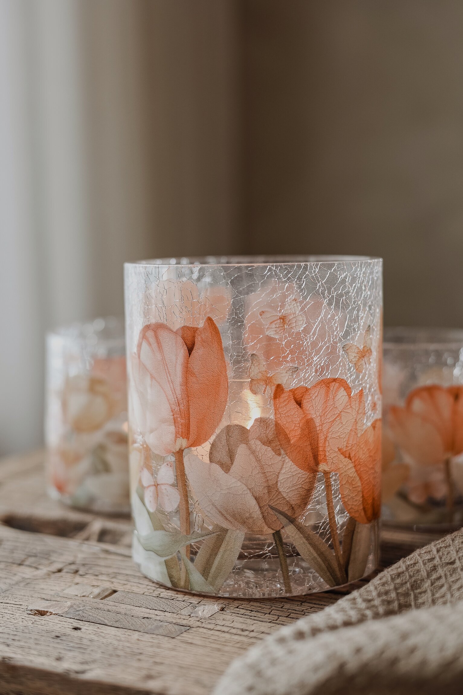 Vacker ljuslykta, handgjord i krackelerat glas och dekorerad med vackra tulpaner. Varje lykta är unik, med små variationer i glasets tjocklek och sprickor, vilket ger en charmig och levande känsla.
