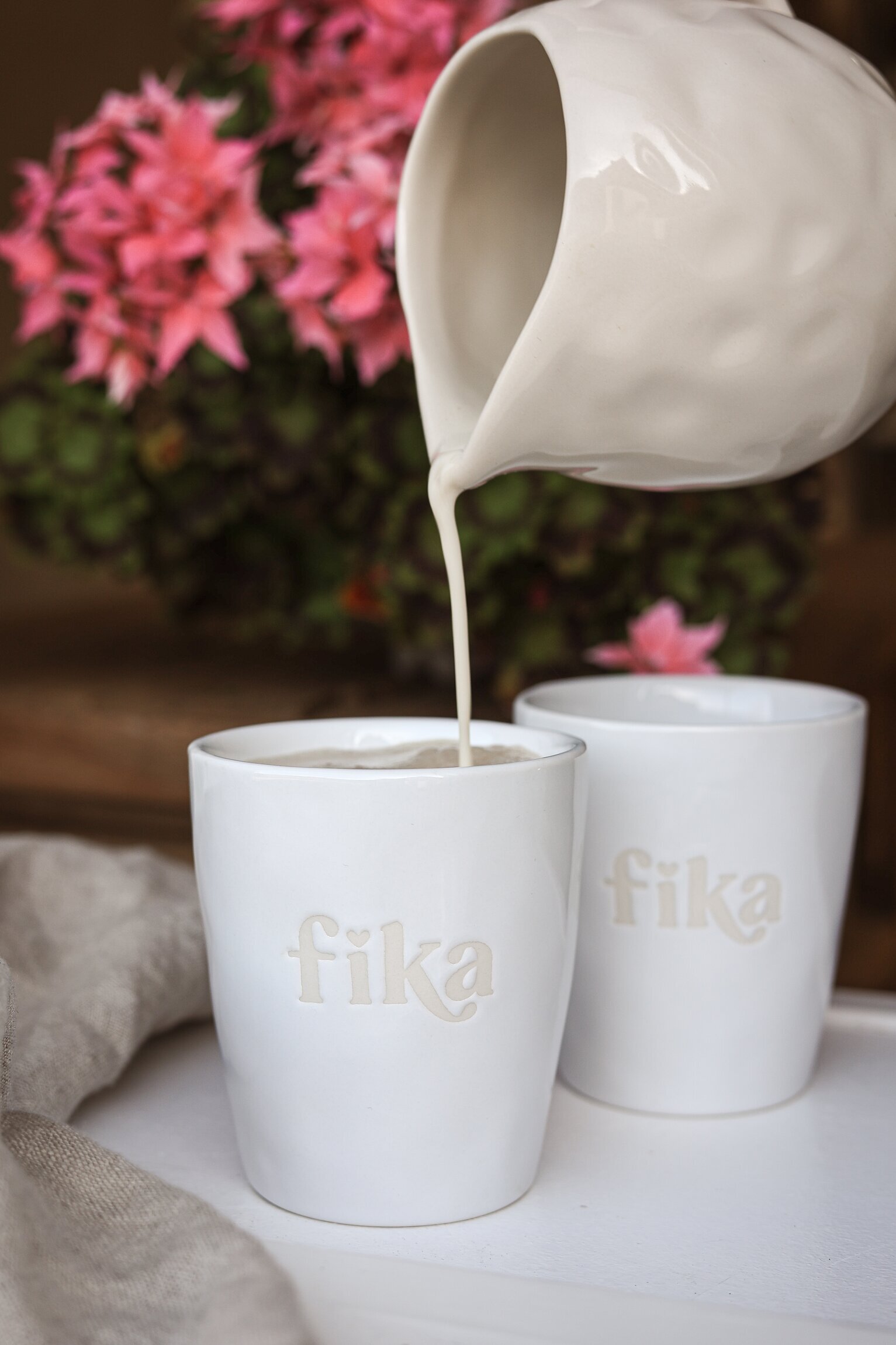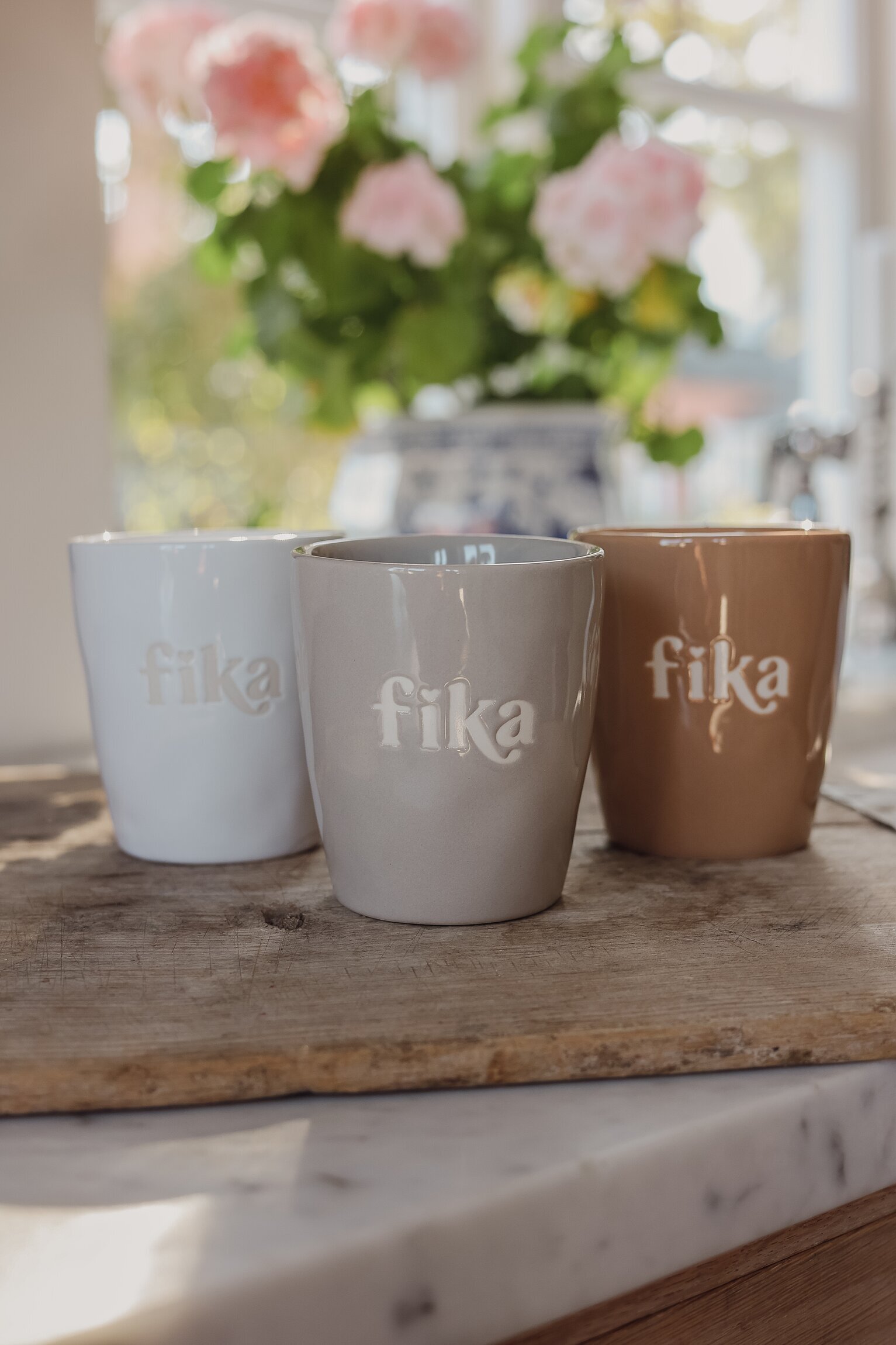 Ljuvliga muggar med texten Fika i fina basfärger och silkscreen-text i keramiken. Perfekt till vardagens kaffestunder – eller som en omtänksam present.