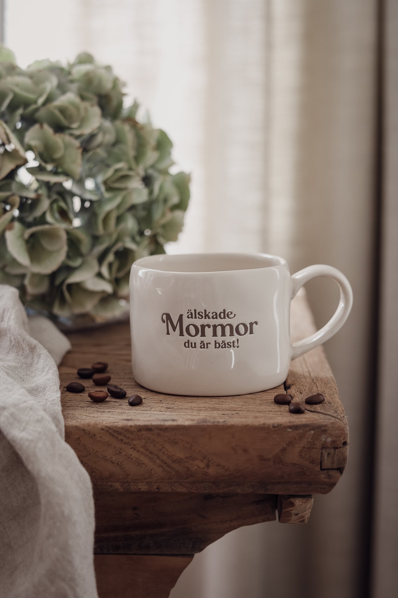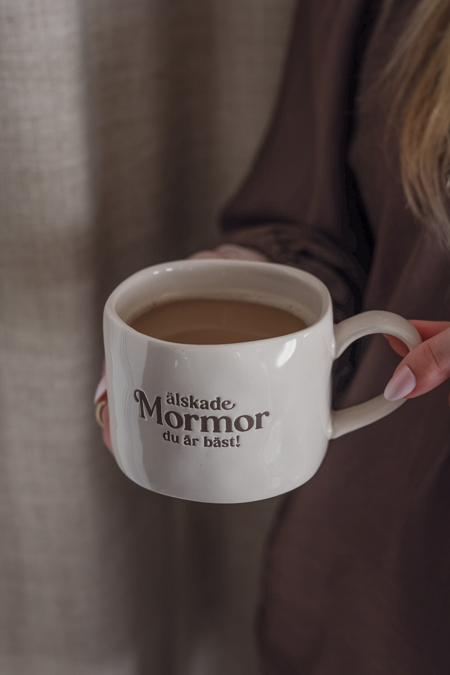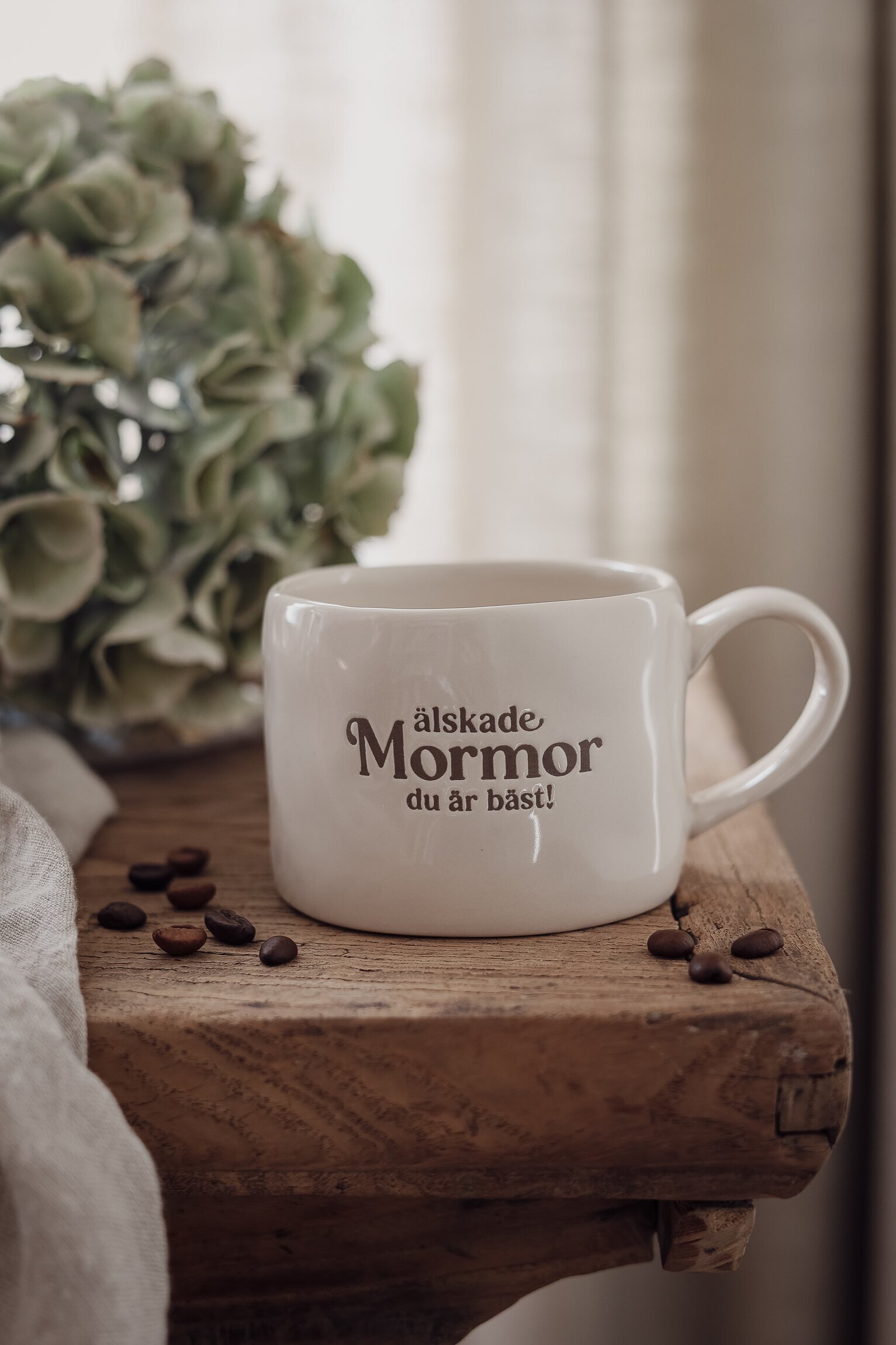 Mugg i stengods med texten Älskade mormor – en varm och omtänksam present till den du tycker extra mycket om. Läs mer