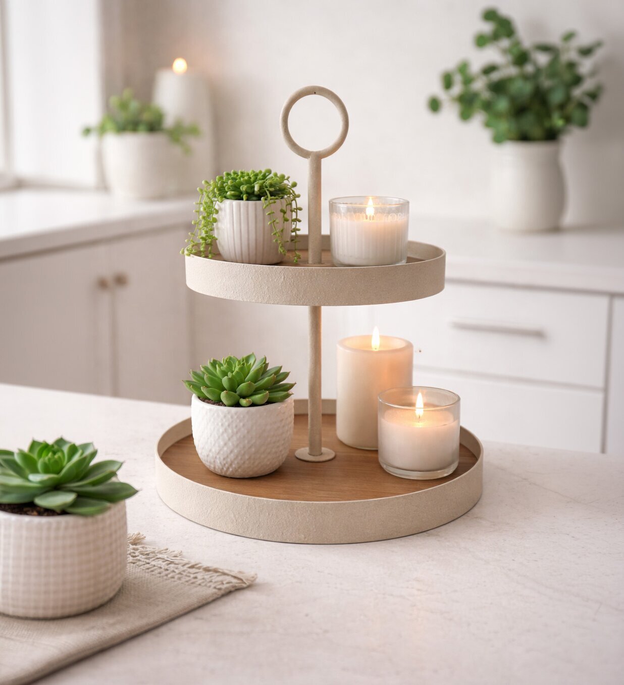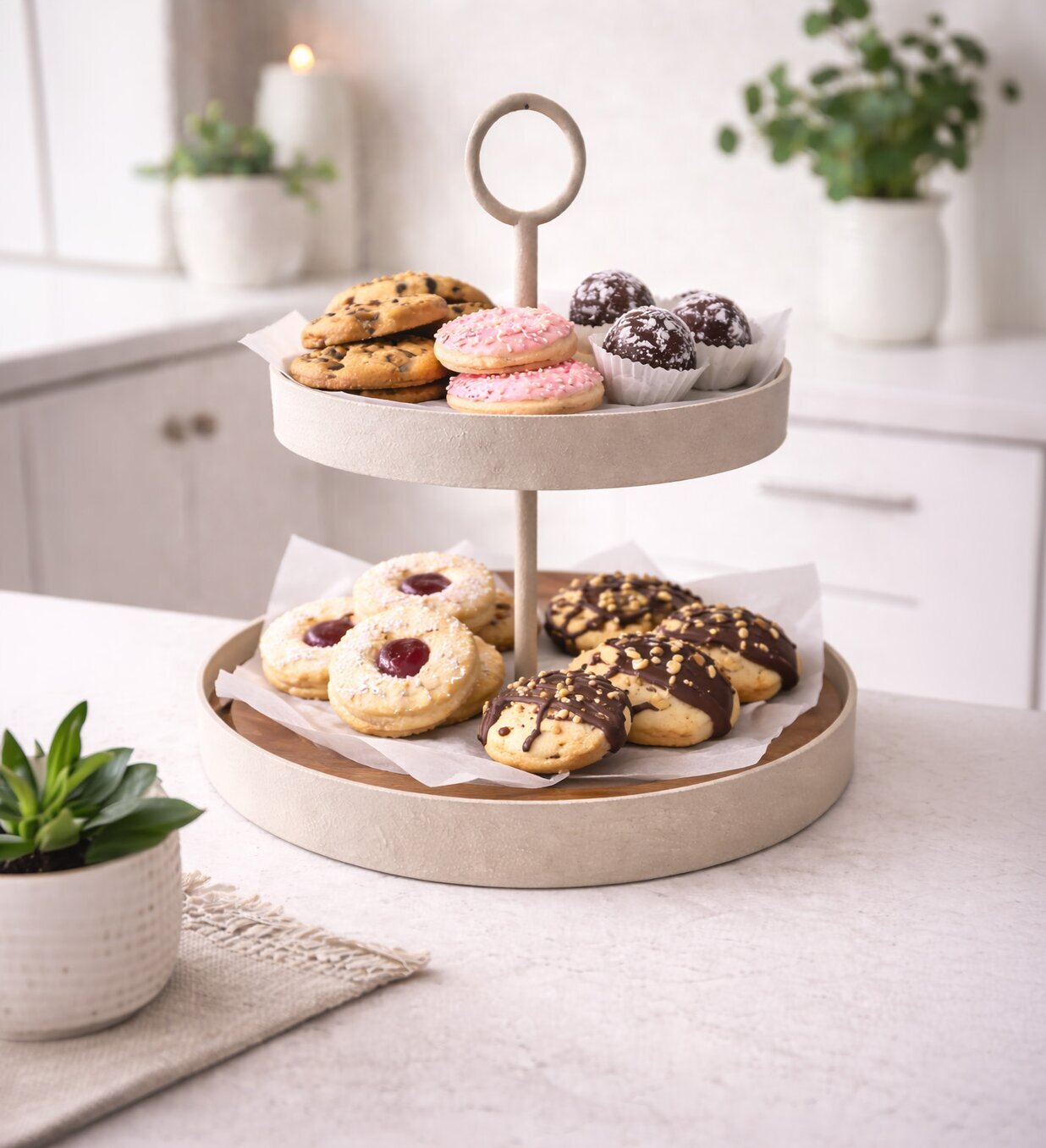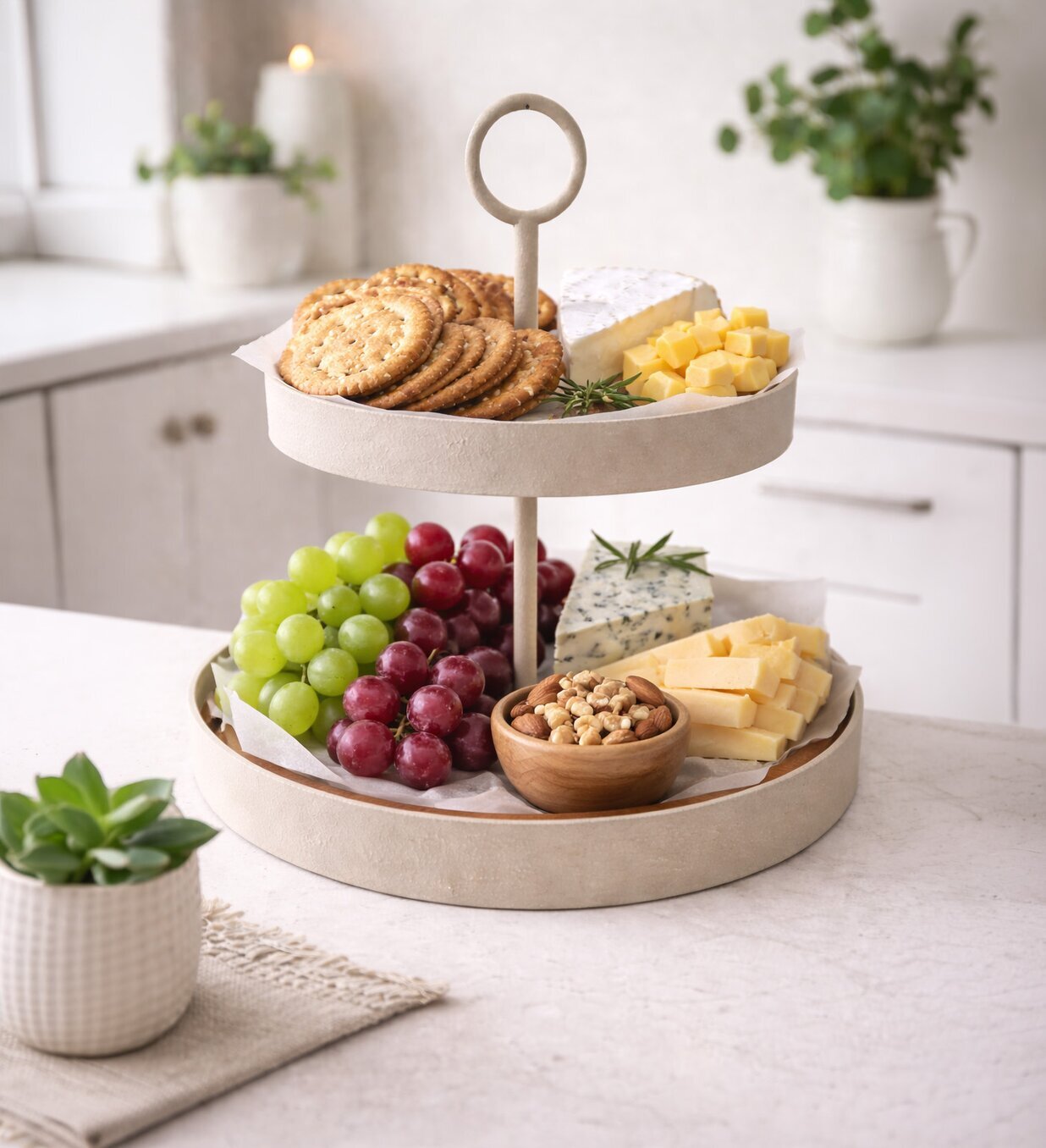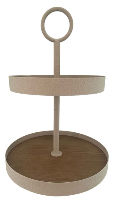 Ett stilrent 2-våningsfat, perfekt för servering av kakor, frukt, småplock eller som en vacker detalj i köket. Den tvådelade designen ger gott om plats och gör det enkelt att skapa en inbjudande dukning. Det dekorativa handtaget upptill gör fatet både praktiskt att bära och extra elegant i sitt utförande. En fin inredningsdetalj som passar lika bra till vardag som till fest.