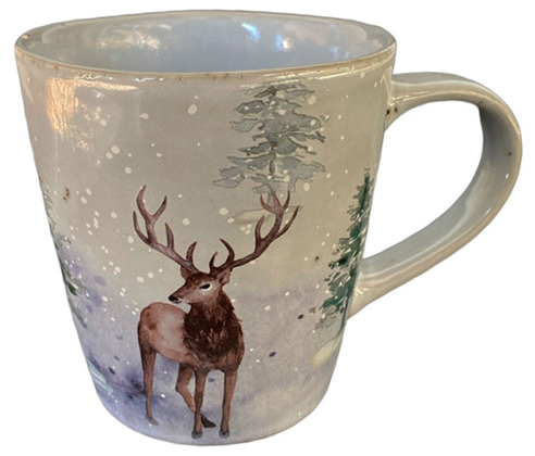 Skapa en stämningsfull dukning med denna vackra mugg i stengods, dekorerad med ett handmålat vintermotiv av granar och en ståtlig hjort i snöfall. Perfekt för att njuta av varm choklad, te eller kaffe under kyliga dagar. Den mjuka färgskalan och den rustika känslan gör att muggen passar lika bra till vardag som till fest.