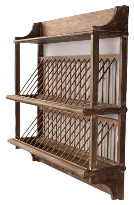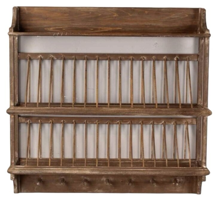 En dekorativ vägghylla i trä med rustik känsla och tidlös charm. Med två praktiska hyllplan, tallriksställ och krokar nedtill blir den både vacker och funktionell i köket. Perfekt för att förvara tallrikar, små köksdetaljer, handdukar eller redskap och samtidigt skapa en varm och ombonad känsla i rummet. En stilfull inredningsdetalj som kombinerar smart förvaring med klassisk lantlig karaktär.