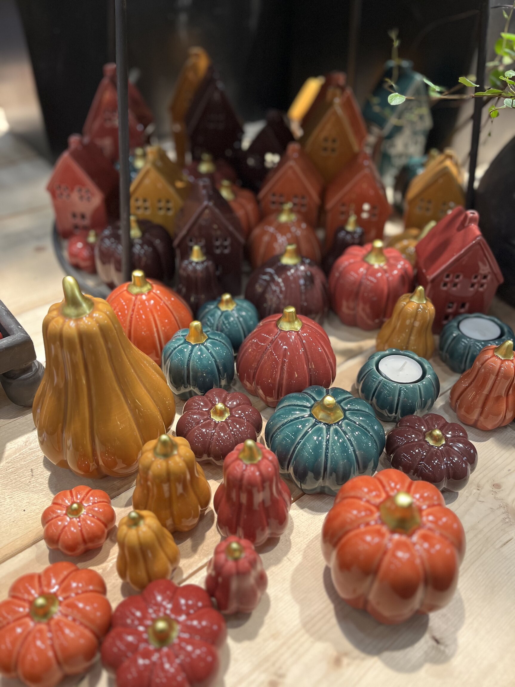 Charmiga dekorationspumpor i keramik blir en perfekt detalj till ditt hem. Med sin eleganta, blanka yta och gyllene topp ger de en känsla av lyx, samtidigt som deras olika former och vackra färger gör varje pumpa unik.
