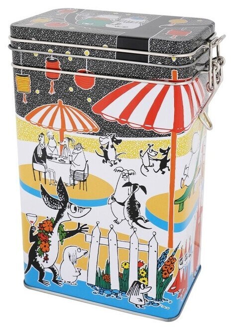 Kaffeburk i plåt med snäpplås samt tätslutande lock. Plåtburken har ett höstigt & färgglatt motiv från Mumindalen, där Mumintrollet förbereder sig inför skördefesten. Plåtburken rymmer 500 grams kaffe. Handdisk samt noggrann torkning rekommenderas.