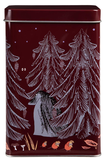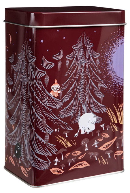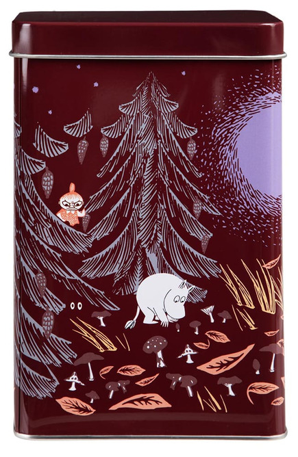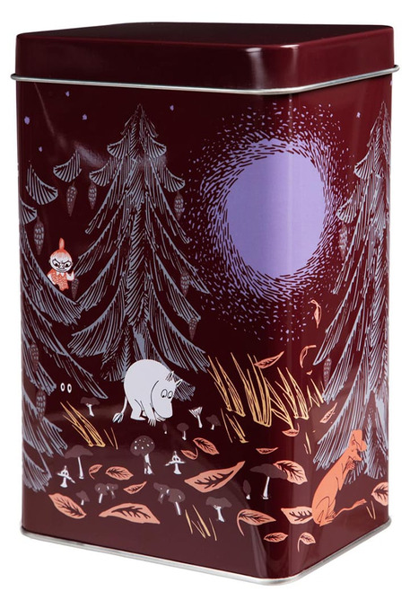 En elegant plåtburk i djupt vinröd nyans med ett sagolikt Muminmotiv. Under den lysande månen samlas Mumintrollet och hans vänner i skogens stillhet – ett motiv som fångar höstens lugna stämning.