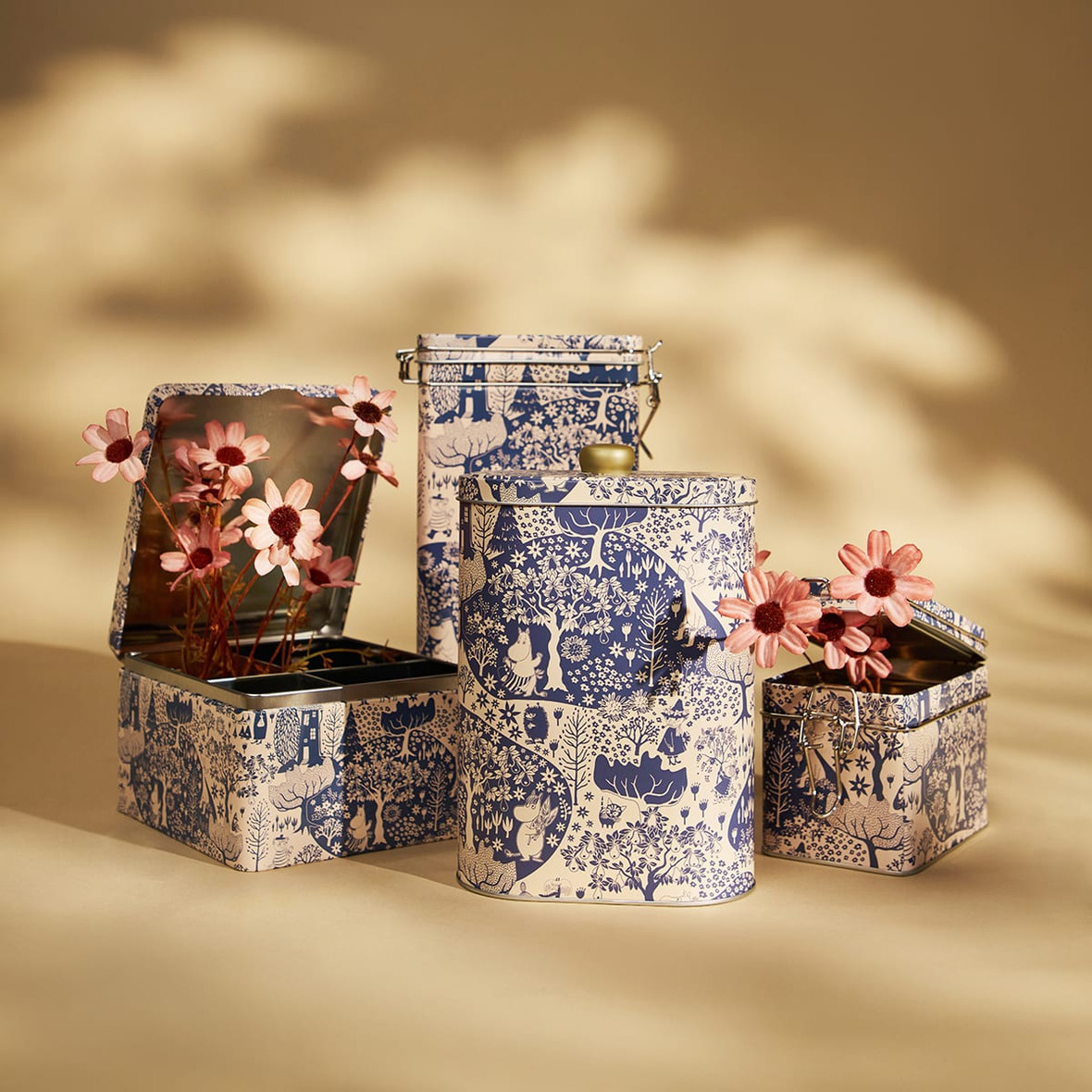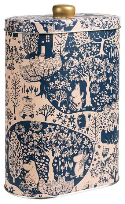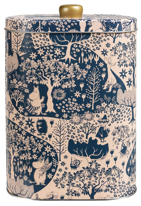 Förvara ditt te, kaffe, kakor eller småsaker med stil i denna underbara plåtburk med klassiskt Muminmotiv. Burken pryds av ett detaljerat mönster i blått och beige/rosa där Muminfamiljen och deras vänner vandrar genom den blomstrande skogen.