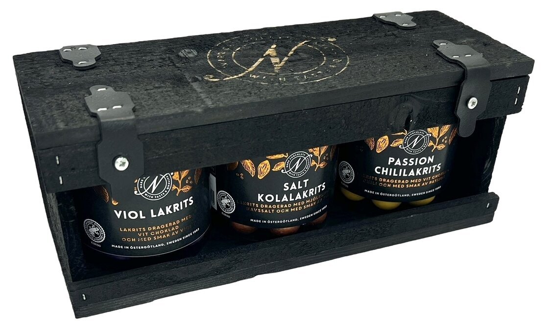 En mycket lyxig trälåda med våra utvalda lakrits favoriter Viol lakrits, Salt kolalakrits, och Passion chililakrits.