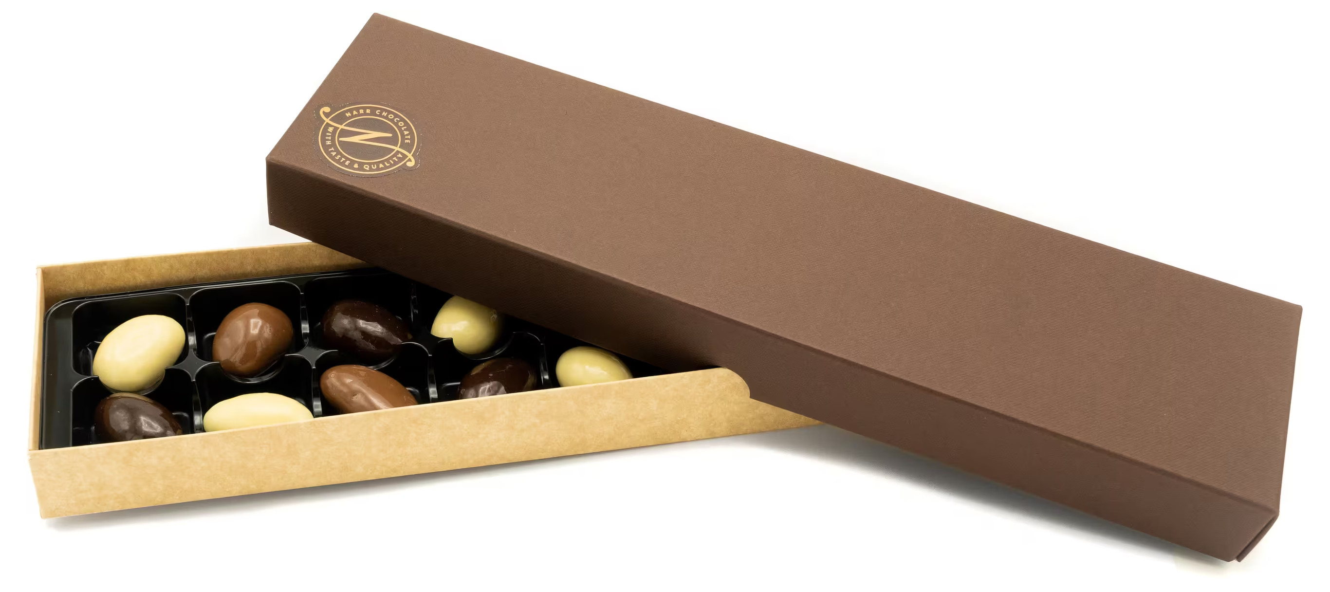 En lyxig presentask med chokladdragerade paranötter. Läs mer