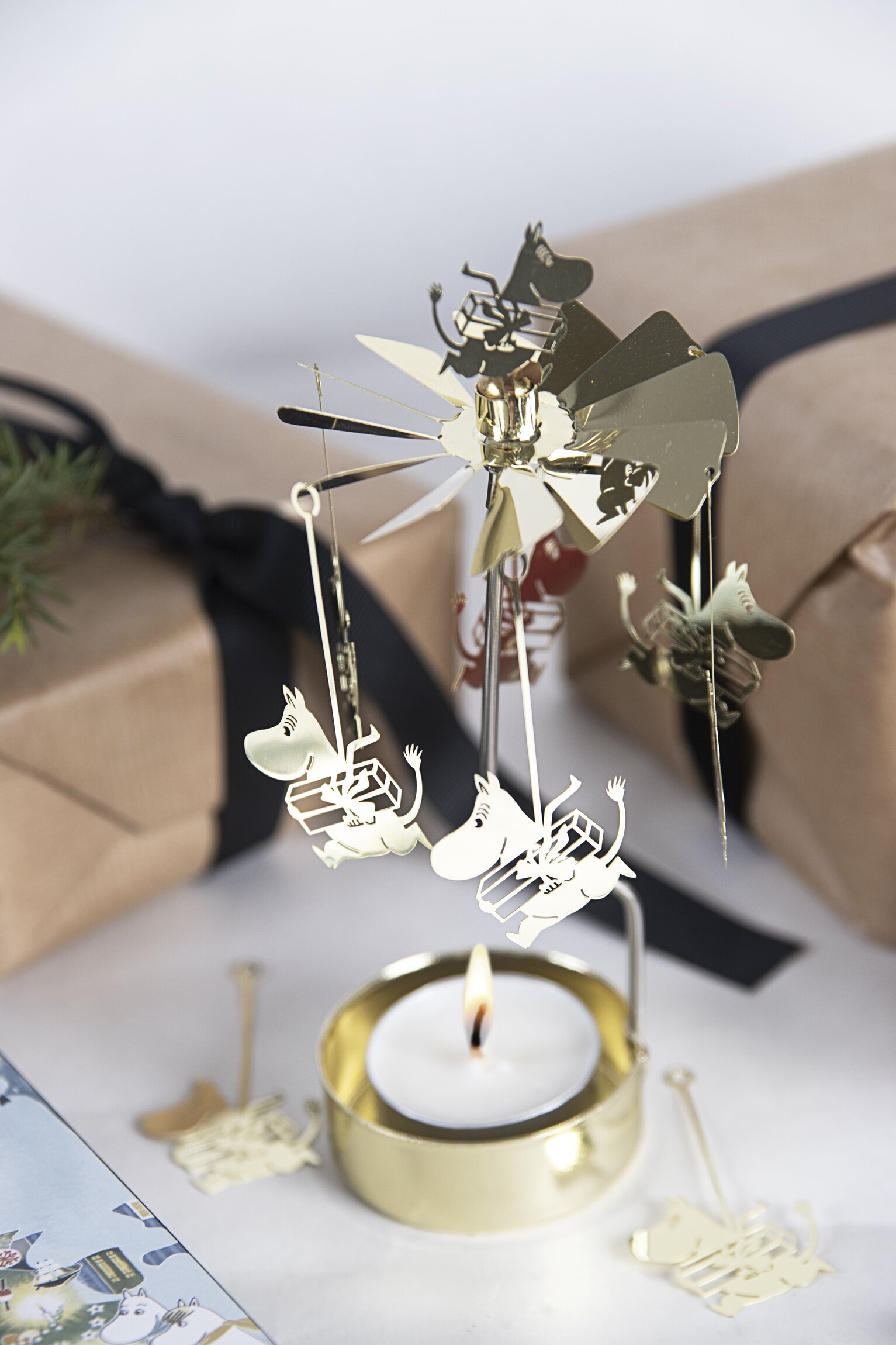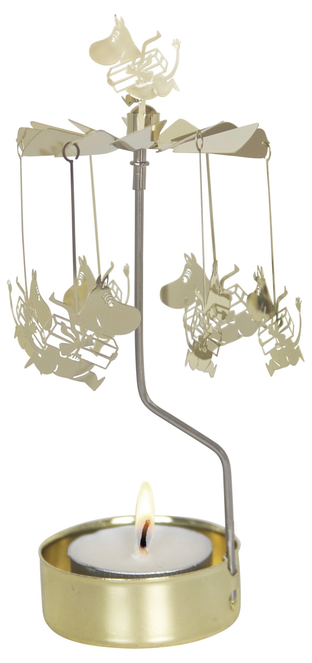 Änglaspel i skimrande guldmetall med plats för värmeljus, föreställande mumintrollen med presenter. Finns i flera olika varianter & färger.