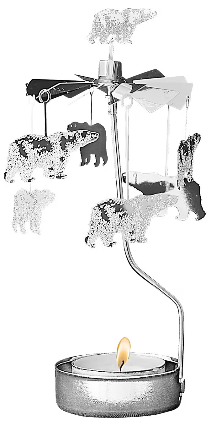 Änglaspelet är elegant format med en roterande funktion som drivs av värmen från ett tänd värmeljus placerat nertill. Ljuset, med en klar och lugn låga, är inneslutet i en liten cirkulär bas, som stödjer mittstången för konstruktionen. När lågan brinner, genererar den just tillräckligt med värme för att få konstruktionen att sakta snurra, vilket skapar en lätt och lekfull rörelse bland björnarna.