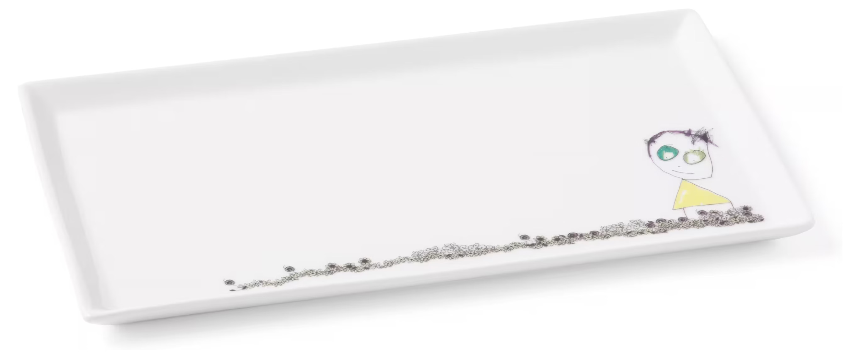 Tallriken "Be Friends" från Poul Pava är en rektangulär servisdel som utmärker sig med sin unika design och konstnärliga touch. Den är tillverkad av högkvalitativt porslin, vilket både känns robust och samtidigt ger ett raffinerat intryck. Tallrikens rena vita yta fungerar som en perfekt duk för den lekfulla och naivistiska illustration som pryder ena kanten.