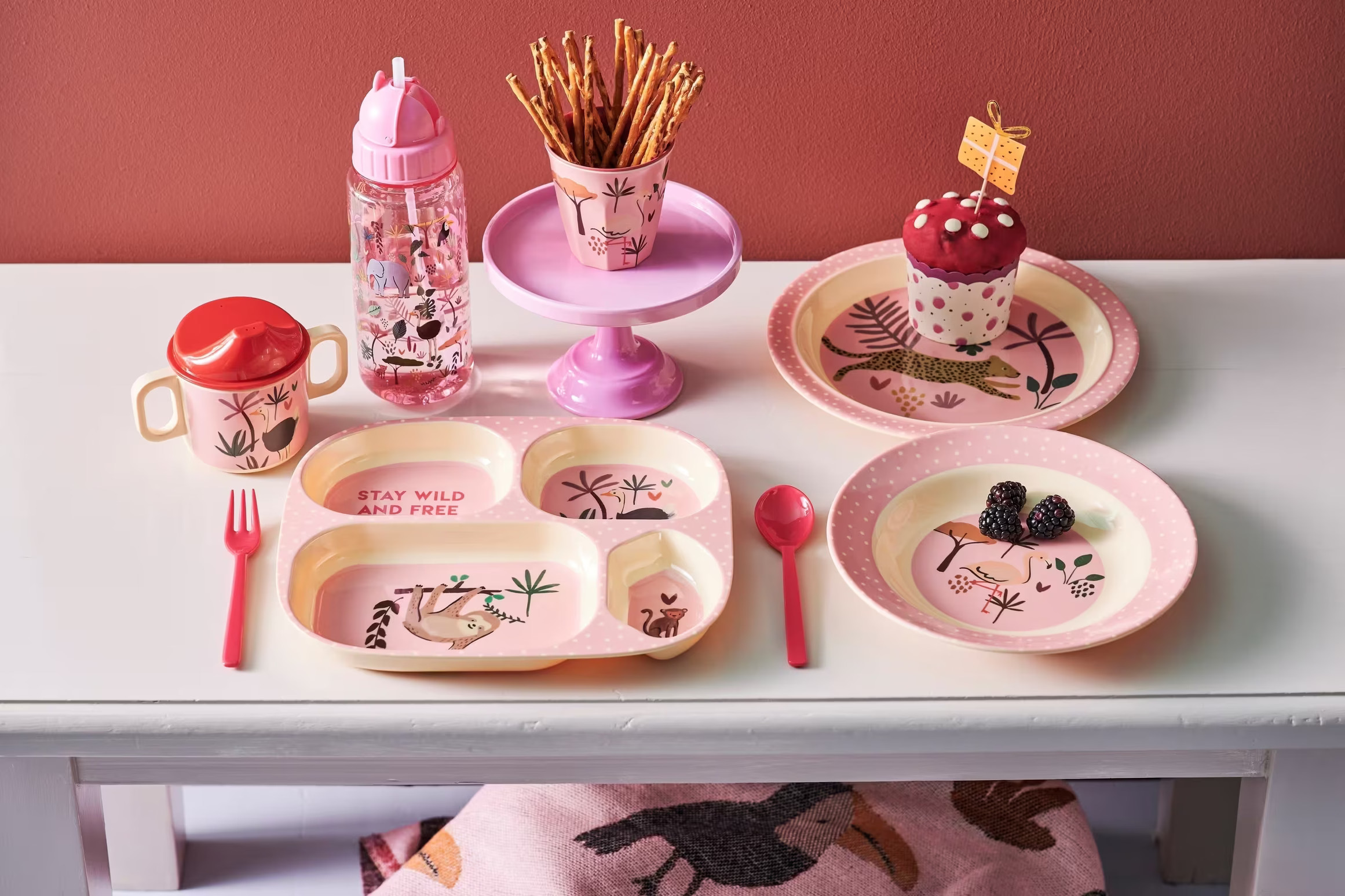 Sammanfattningsvis ger detta arrangemang en lekfull och välkomponerad blickfångare, med dryckesflaskan Pink Jungle Animals Print från Rice tydligt i centrum. Den uppvisar hur väl produkten kan integreras i en vardaglig men ändå färgglad och fantasieggande matstund för barn.