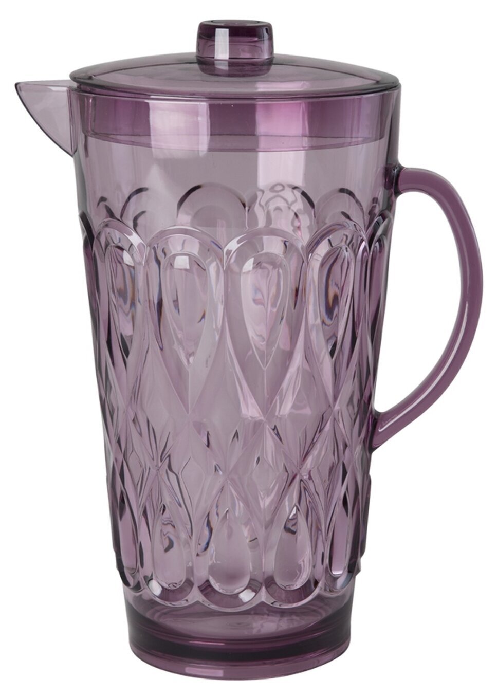 Stor och elegant kanna i lila akryl med en härlig retrokänsla och ett vackert facettslipat mönster. Den blir en dekorativ detalj på bordet, både till vardags och när du dukar upp till gäster. Tack vare locket kan du enkelt ta med kannan ut och servera vatten, saft eller annat – utan att behöva oroa dig för flugor och getingar.