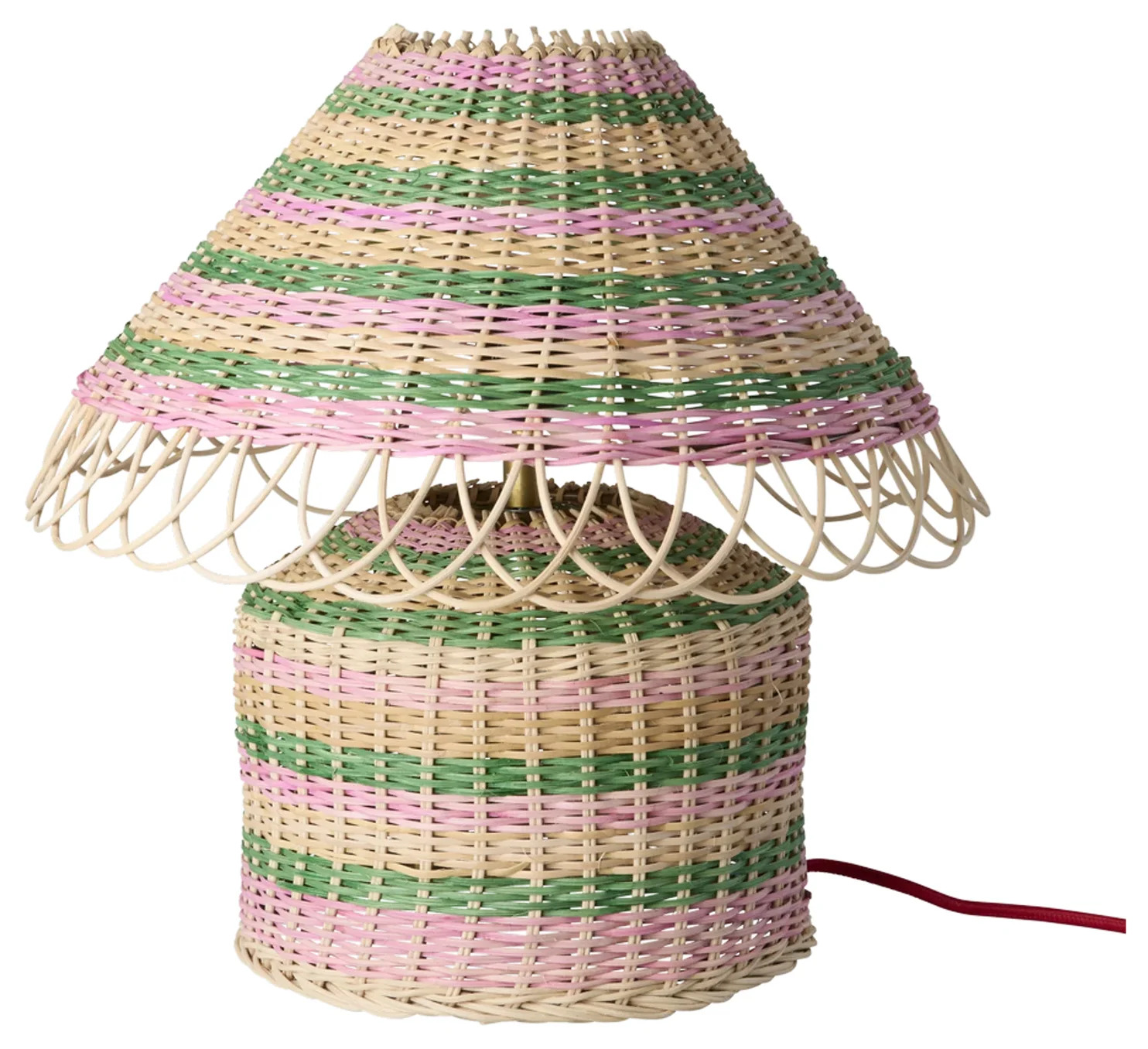Charmig bordslampa med handgjorda detaljer. Skärm och lampfot är omsorgsfullt handflätade i naturlig rotting och pryds av stilrena ränder i rosa och grönt – en perfekt mix av värme och färg som ger rummet ett mjukt, inbjudande ljus.