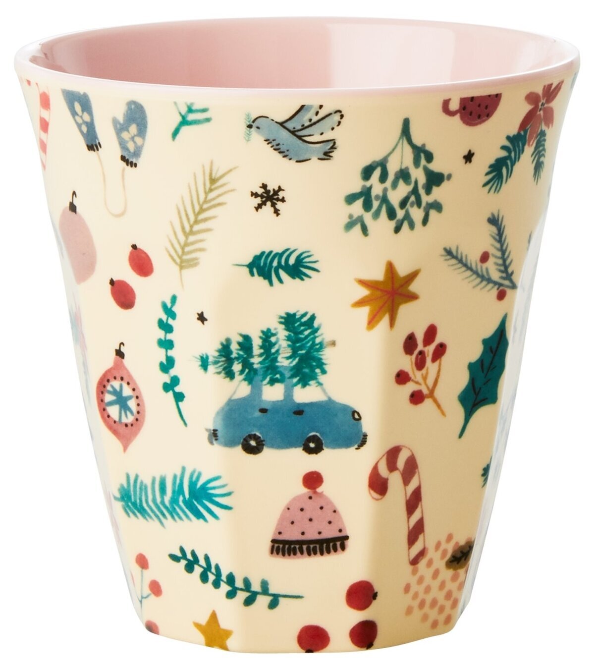 Bildens mugg kommer från produktserien "Melaminmugg Christmas Print", ett samarbete med varumärket Rice, och finns att köpa hos inredningsbutiken RumAttÄlska.se. Den fångar uppmärksamhet med sitt levande julmotiv som skapar en festlig stämning. Muggen har en behaglig rundad form utan handtag och är utformad i melamin, vilket gör den både slitstark och lätt att hantera, idealisk för både barn och vuxna.