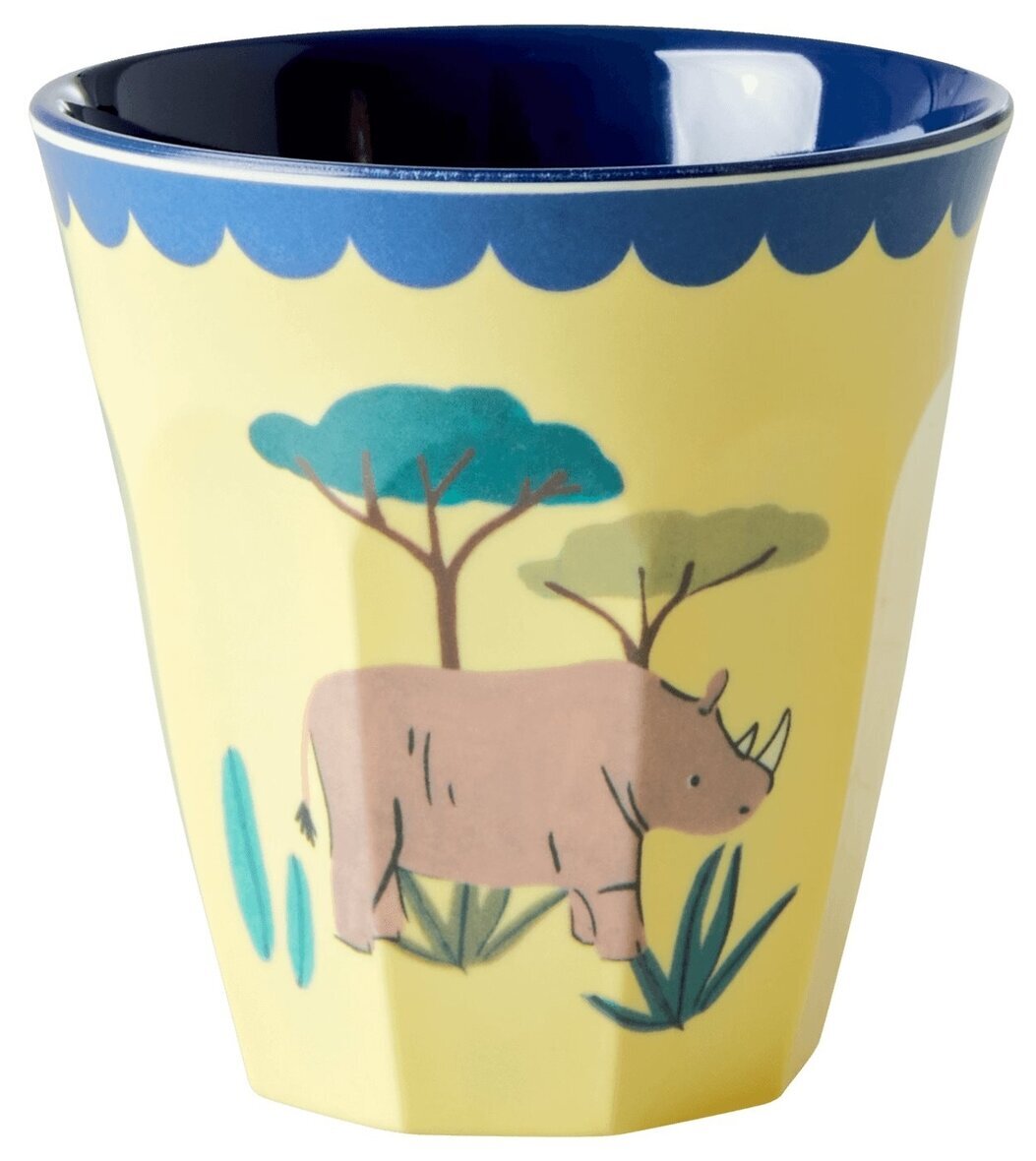 På bilden ser vi en av de unika muggarna från RumAttÄlska och produkten Små Muggar 6-Pack, Funky Blue Prints av varumärket Rice. Denna mugg visar en levande illustration som fångar ögat med sina färgstarka och lekfulla motiv. Utvändigt pryds muggen av ett rhino-motiv mot en mjuk gul bakgrund som ger en känsla av lekfullhet. Rinoceroset står på grönska, omringat av stiliserade träd som bidrar till en känsla av natur och äventyr.