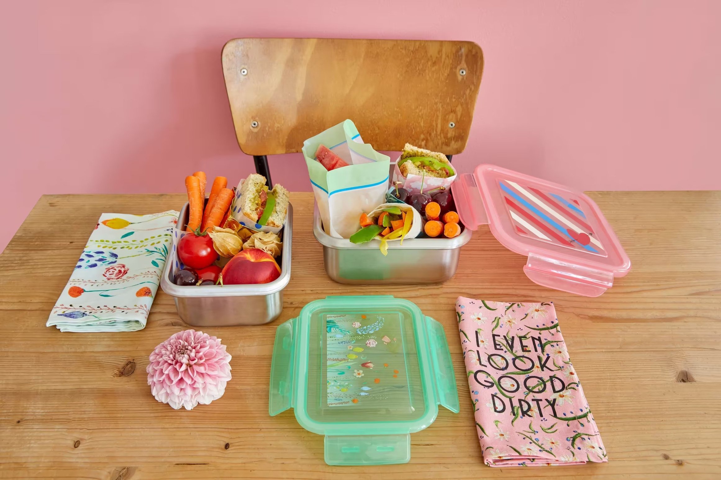 Detta produktfoto framhäver också hur tygservetterna från Rice kan användas i praktiska sammanhang, som till exempel vid packning av luncher eller utflykter. De kan enkelt matchas med varierade färgkombinationer och mönster, som tydligt framgår av sammansättningen i bilden. Omgivningen i bilden, med sin färgglada och inbjudande känsla, hjälper till att framhäva produktens mångsidighet och praktiska användbarhet.