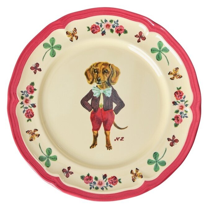 Denna charmiga melamintallrik från Rice, skapad i samarbete med den franska konstnären Nathalie Lété, förenar lekfullhet med elegans. Den stilige taxen i kostym ger en sofistikerad men lekfull känsla, omgiven av blommor & fjärilar.