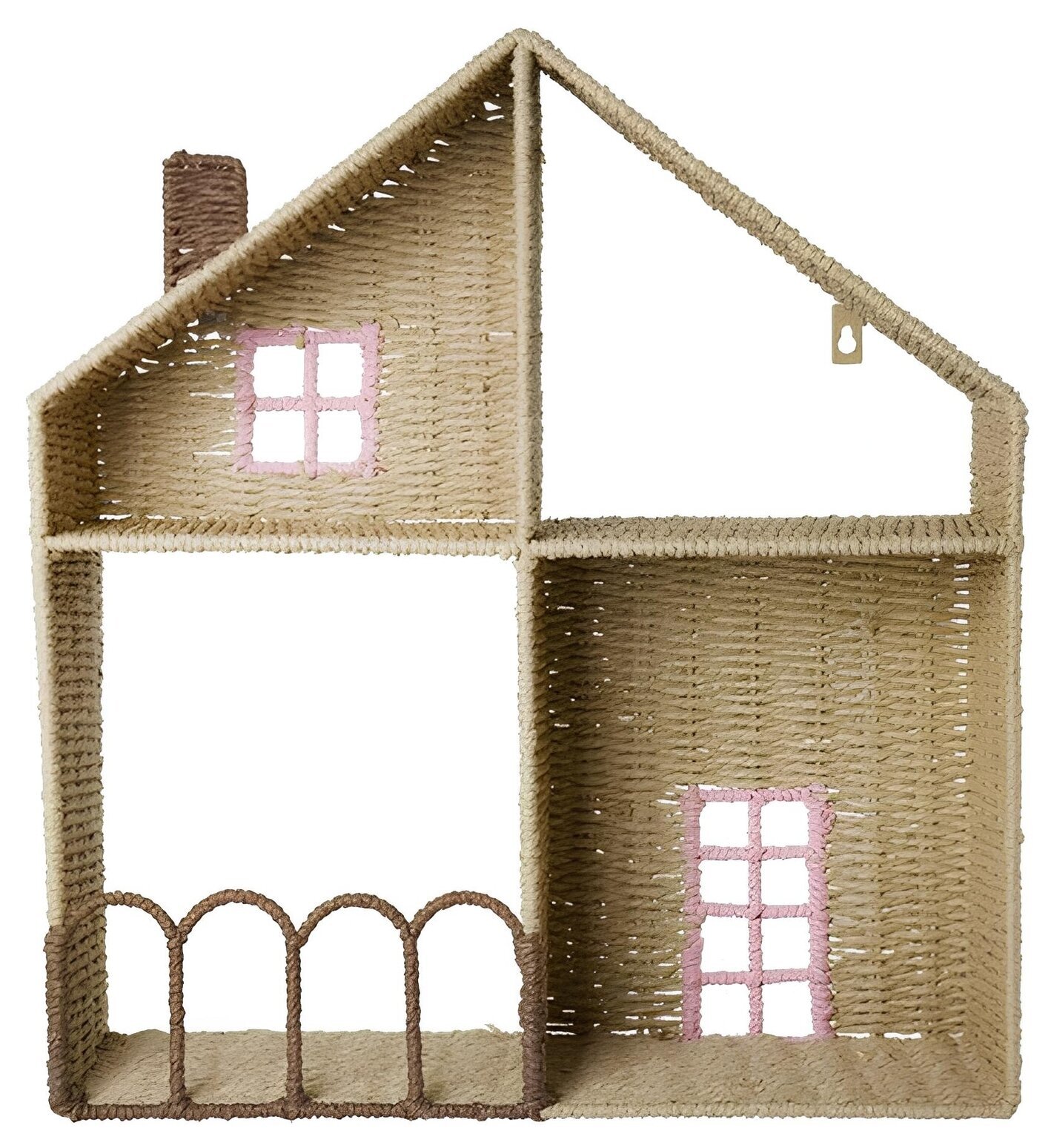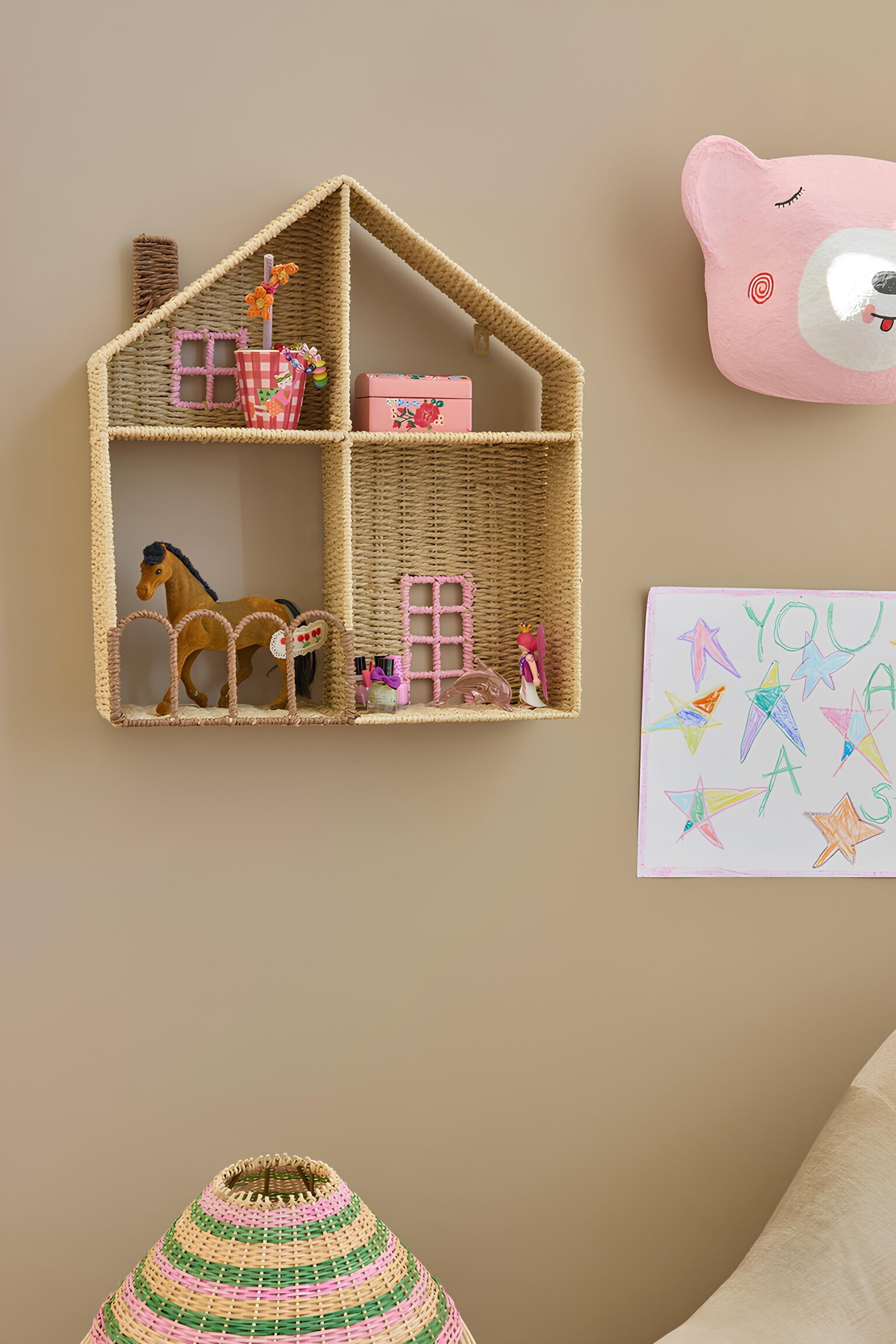 En charmig vägghylla som snabbt blir en fin detalj i barnrummet. Hyllan är formad som ett litet hus och har söta rosa fönster och dörrar samt ett litet brunt staket som ger den en lekfull och ombonad känsla.