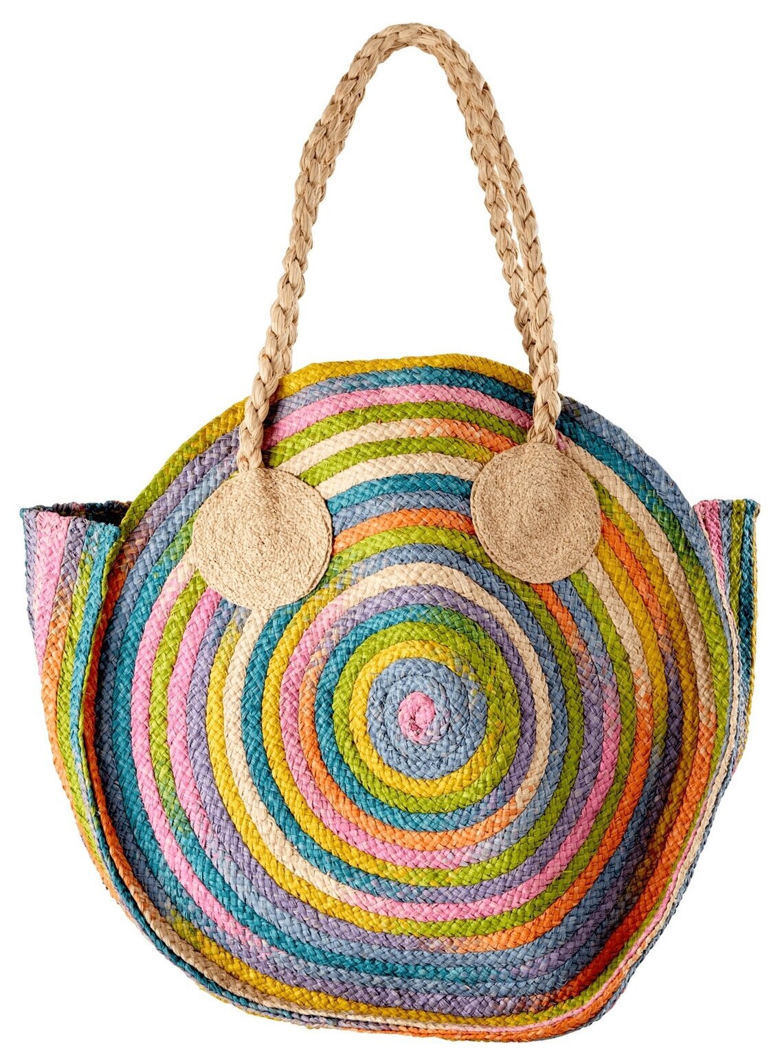 Stor & färgglad raffiaväska med flätade handtag som kan användas både som strandväska eller till förvaring. Maxvikt:10 kg. Då väskan är tillverkad för hand kan det förekomma skillnader i färg, form & utseende.
