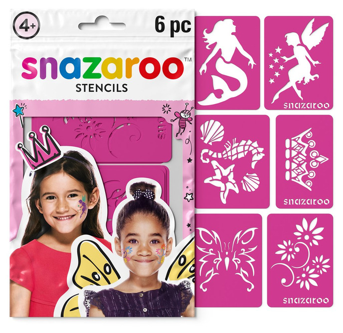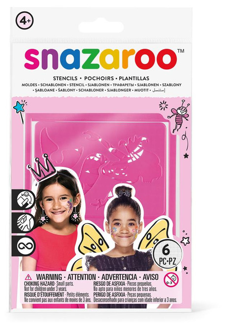 Innehåller sex olika schabloner, lätt att använda och säkra för barn. Självhäftande baksida håller schabloner på plats för att få bra resultat. Böjbara för att passa bra till ansikte, armar och händer. Återanvändbara och tvättbara.