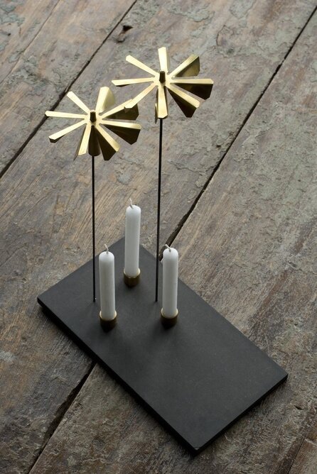 Änglaspel i en lite nyare tappning med 2 stycken snurror samt plats för 3 stycken ljus. Tillverkaren av detta änglaspel ville framkalla känslan som man hade som barn när man fascinerat stod och tittade på de vackra änglarna som snurrade ovanför ljusen. Detta änglaspel har dock inget plingande utan snurrar vackert i sin tysthet. Material: Svart MDF, stål samt mässing. Kommer förpackad i en fin presentbox inkl 3 stycken ljus.