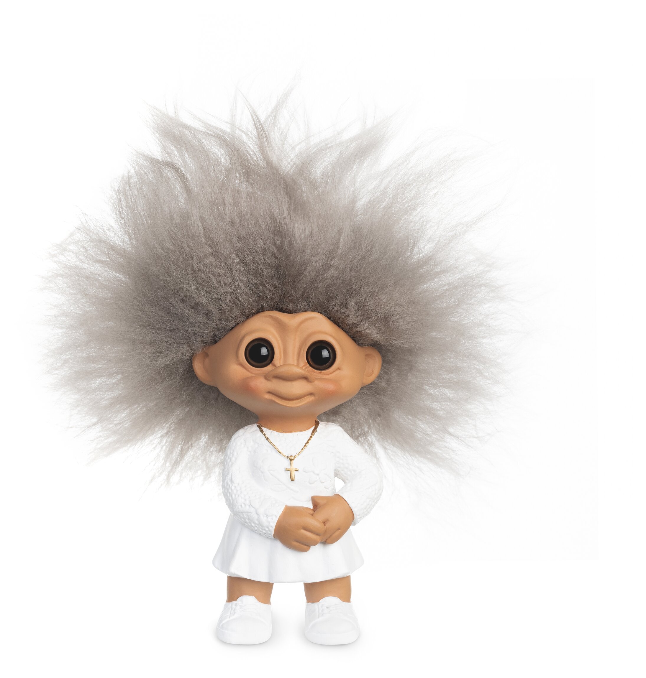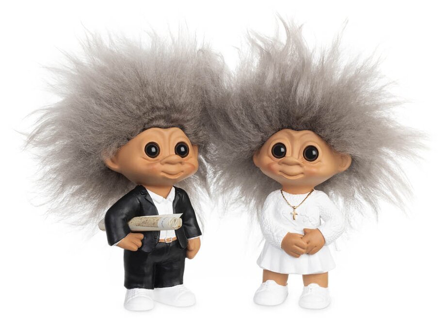 Den här söta konfirmandtrollet är en perfekt liten present när någon ska firas, uppmuntras eller få en omtänksam gåva. Med sitt charmiga hår och sitt tidlösa uttryck passar den lika bra i bokhyllan som på skrivbordet eller i fönstret – en liten påminnelse om att tur och glada stunder ofta börjar i det lilla.