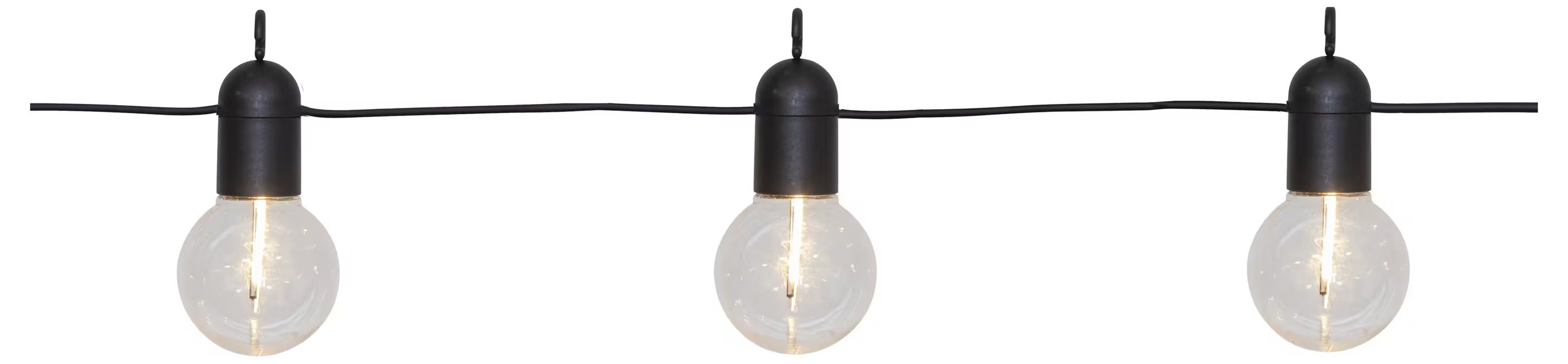 Kabeln som håller samman glödlamporna är tillverkad av slitstarkt material och har en mörk färg, vilket gör den diskret och lätt att integrera i olika miljöer. Kabelns materialval och konstruktion bidrar till att ljusslingan står emot väder och vind, vilket gör den idealisk för både inomhus- och utomhusbruk. Dessutom är glödlamporna utformade för att klara av olika temperaturer och förhållanden, vilket ytterligare bidrar till produktens mångsidighet och hållbarhet.
