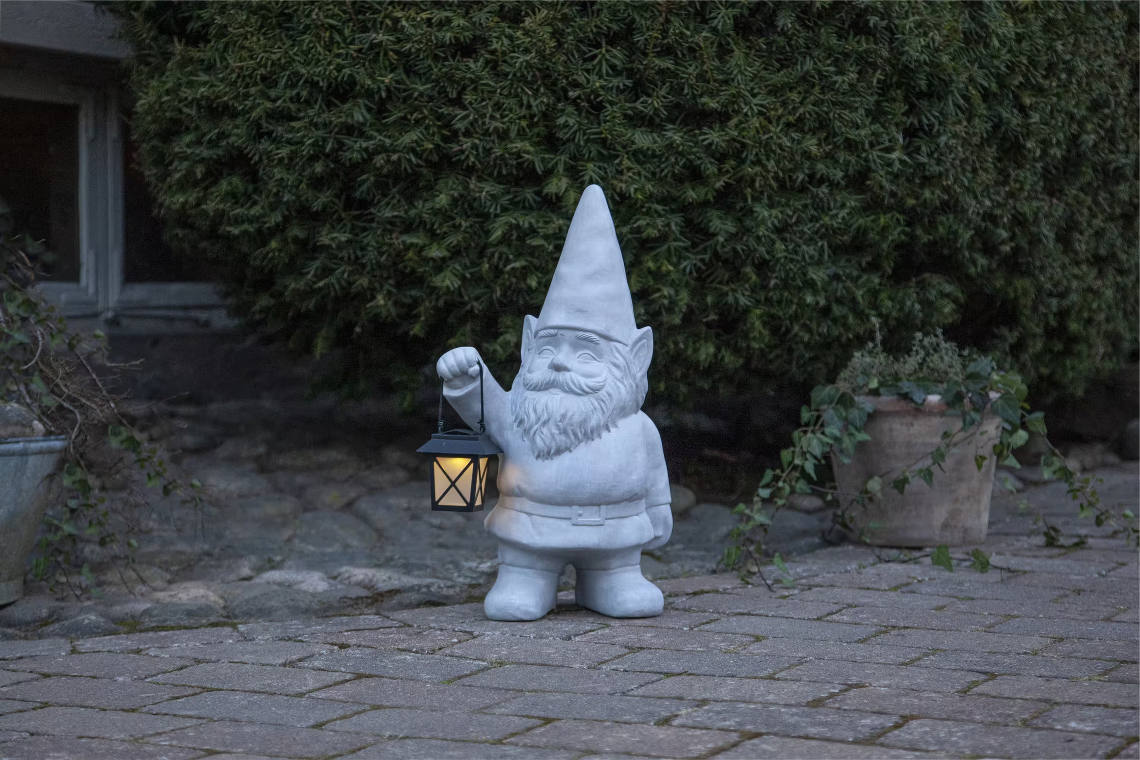 Omgivningen där produkten är placerad består av en stensatt yta med något ojämna plattor, vilket ger en rustik och naturnära känsla. I bakgrunden syns en tät växtlighet med en buske eller litet träd som skapar en naturlig, grön bakgrundsfond. Detta kompletterar Gnomys utseende och framhäver hans lantliga charm. Bredvid honom finns några blomkrukor av terrakotta eller liknande material och fyllda med olika växter, vilket ytterligare stärker trädgårdsmiljön.