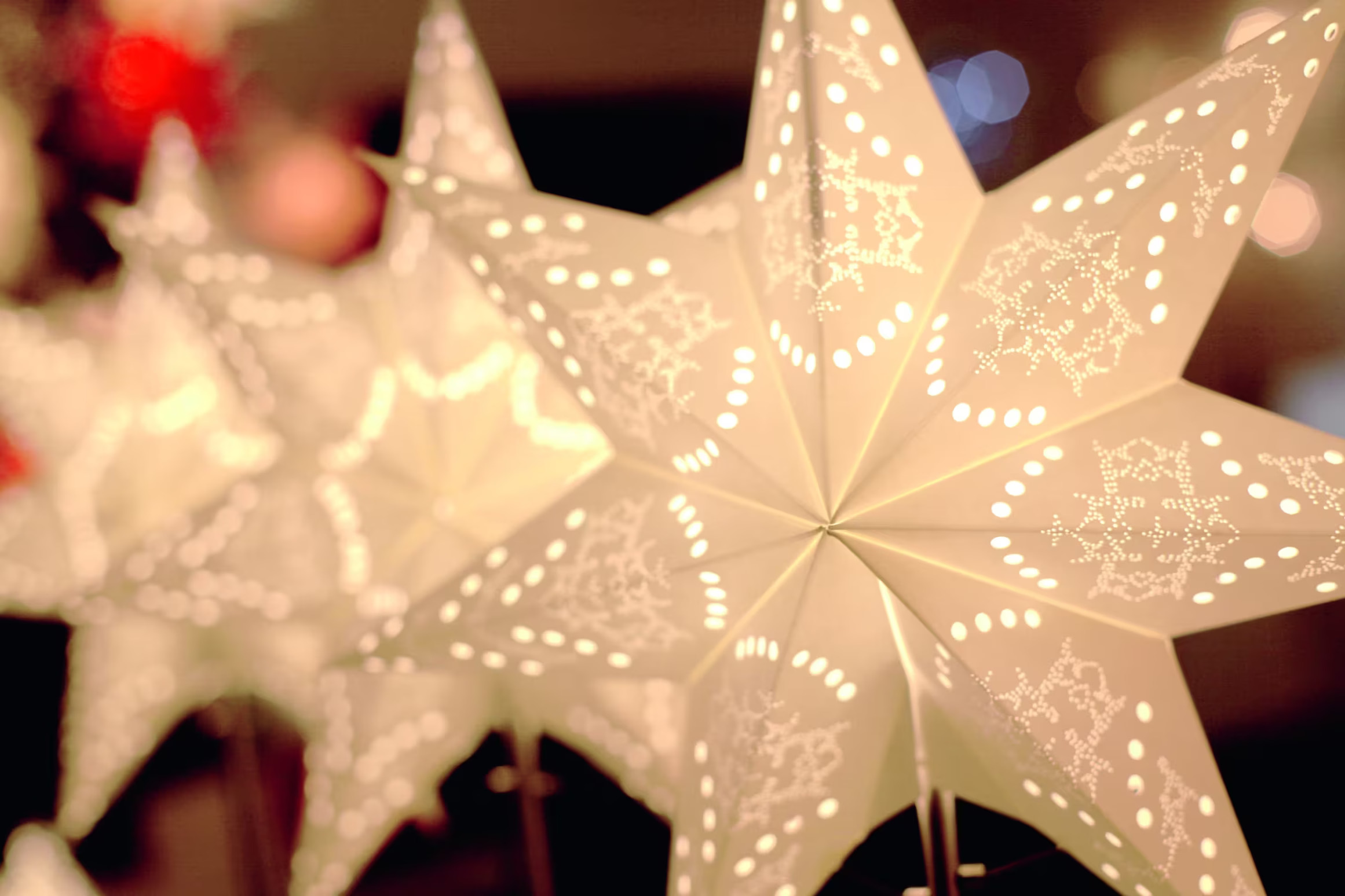 Stjärnan har sju spetsar som skapar en symmetrisk och geometrisk form. Varje spets är dekorerad med rader av små perforerade cirklar och stjärnor, vilket ger ett elegant och genomarbetat utseende. När belysningen är på, sprider de små hålen ljuset från den inre ljuskällan och skapar ett intressant skuggspel på närliggande ytor.