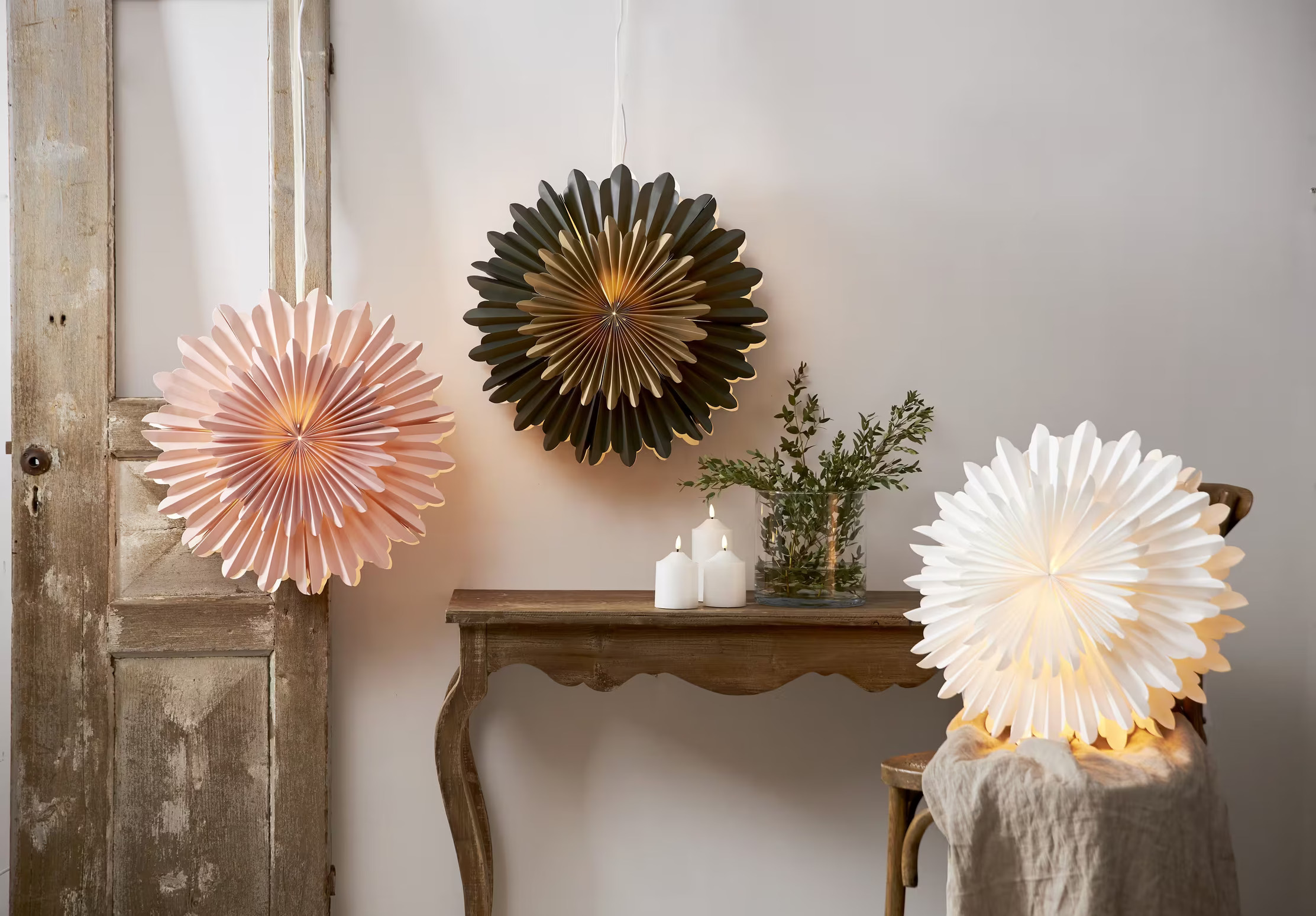 Vacker pappersstjärna i en fin rosa nyans, tillverkad av 2 lager veckat papper med rundade flikar för en harmonisk känsla. Elegant band medföljer för att enkelt kunna hänga upp stjärnan i fönster eller på vägg.