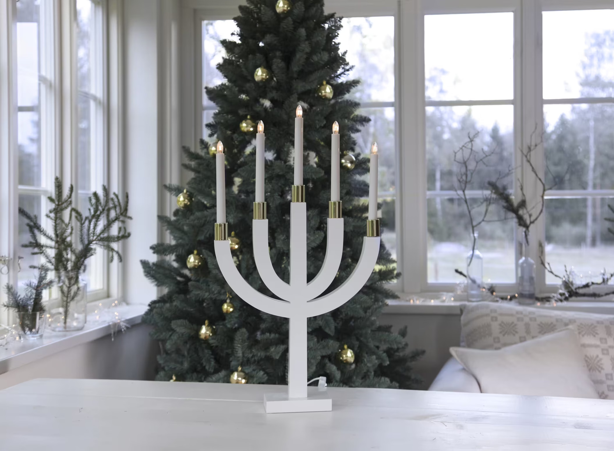 Vacker träljusstake med mässingsdetaljer, fin dekoration att ställa i fönster eller på skåp/byrå. Läs mer