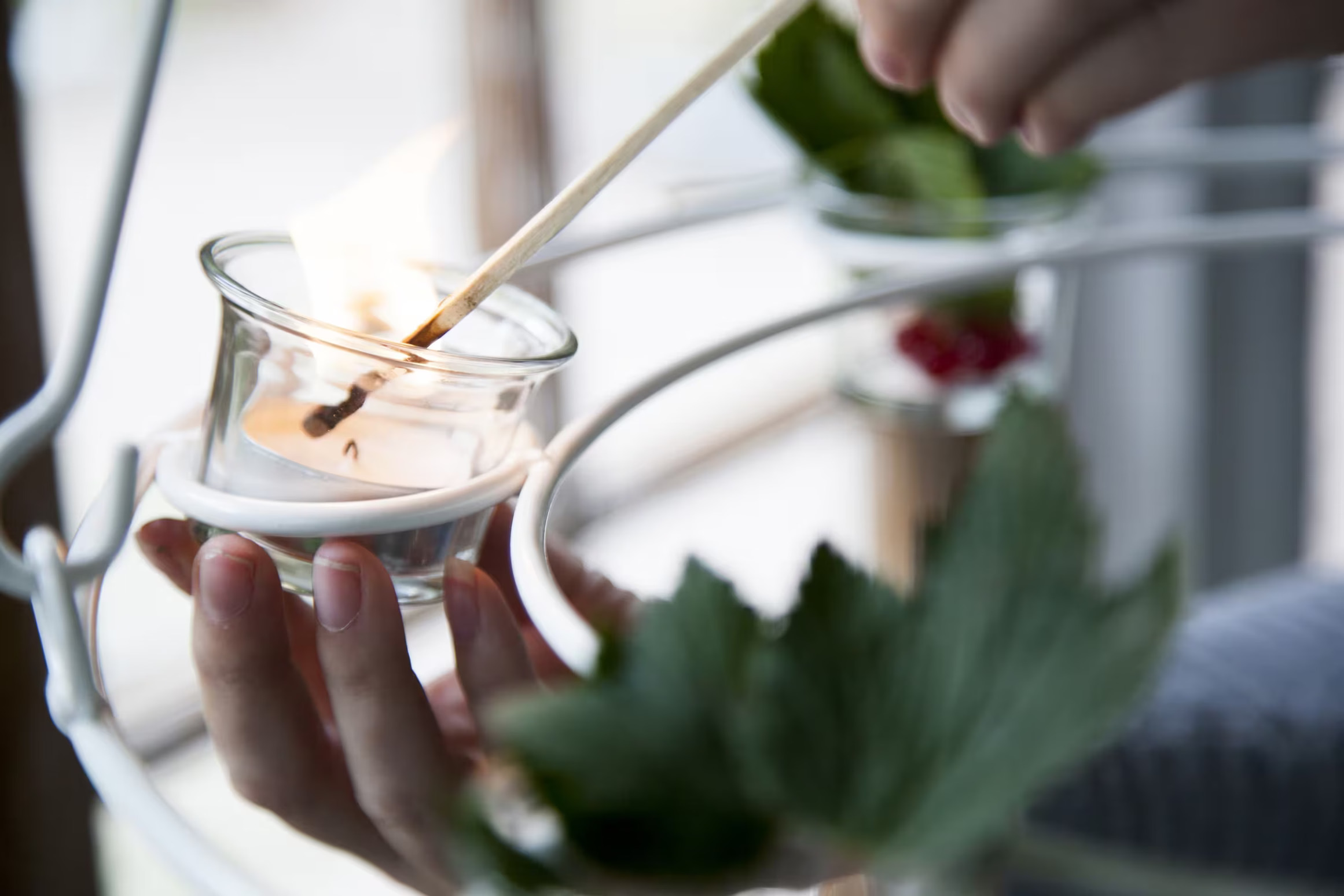 Vacker ljuskrona i vit metall inkl 6 stycken glaskoppar. Dekorera ljuskronan med gröna växter eller granris beroende på säsong. Mått: 44,5 x 73 cm. Läs mer
