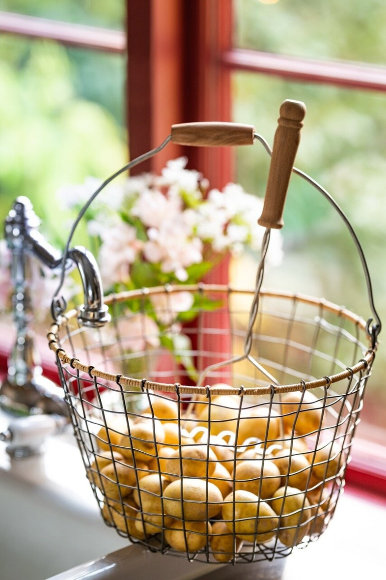 En charmig och praktisk trådkorg i metall med ett avtagbart handtag i trä. Den luftiga designen gör korgen perfekt för förvaring av allt från frukt och grönsaker i köket till filtar, tidningar eller andra småsaker i hemmet.